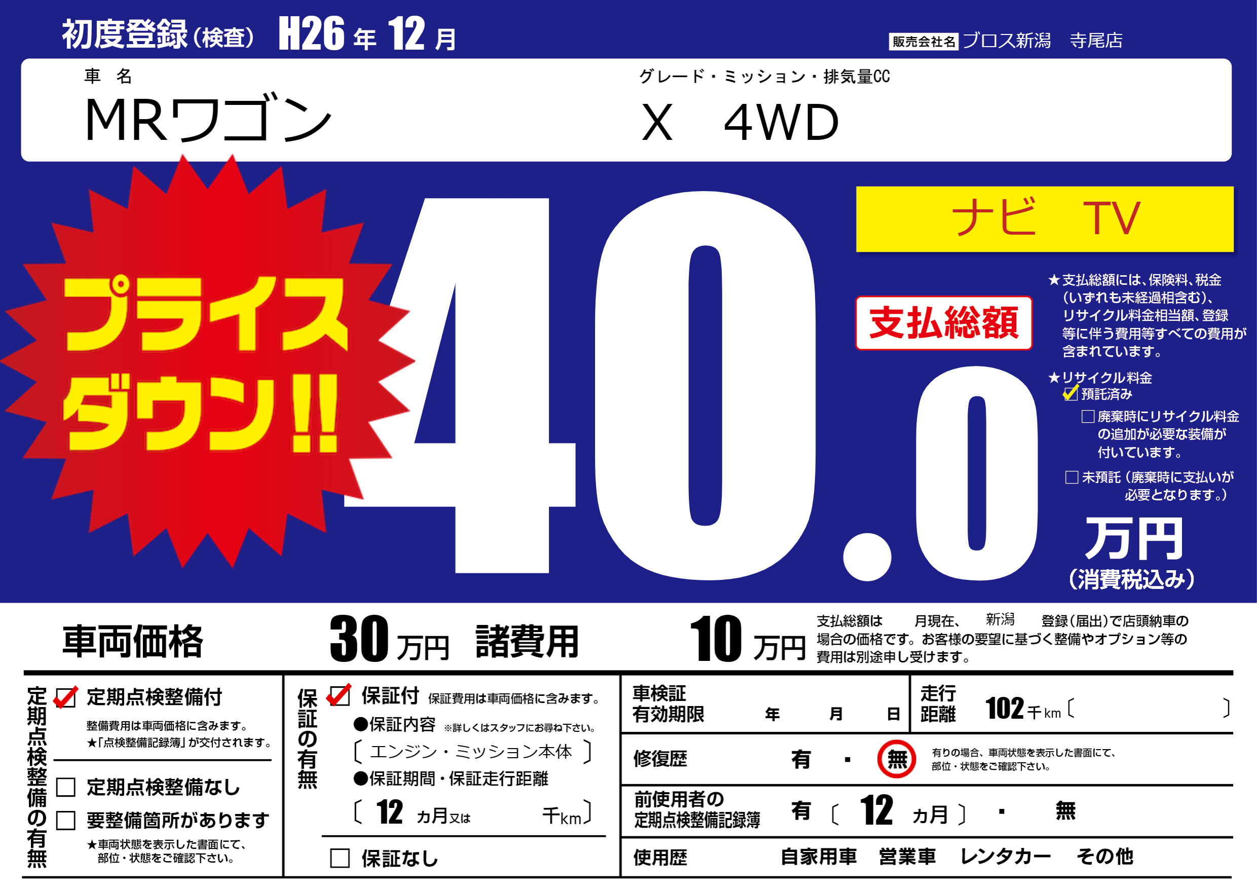 | 車名 | MRワゴン | グレード ミッション 排気量 |