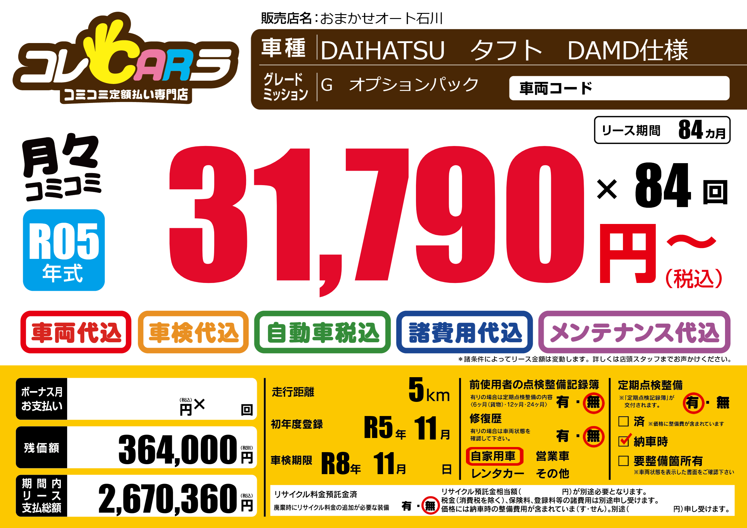 | 走行キロ | 0.5万km | 初年度登録 | R5年11月 |