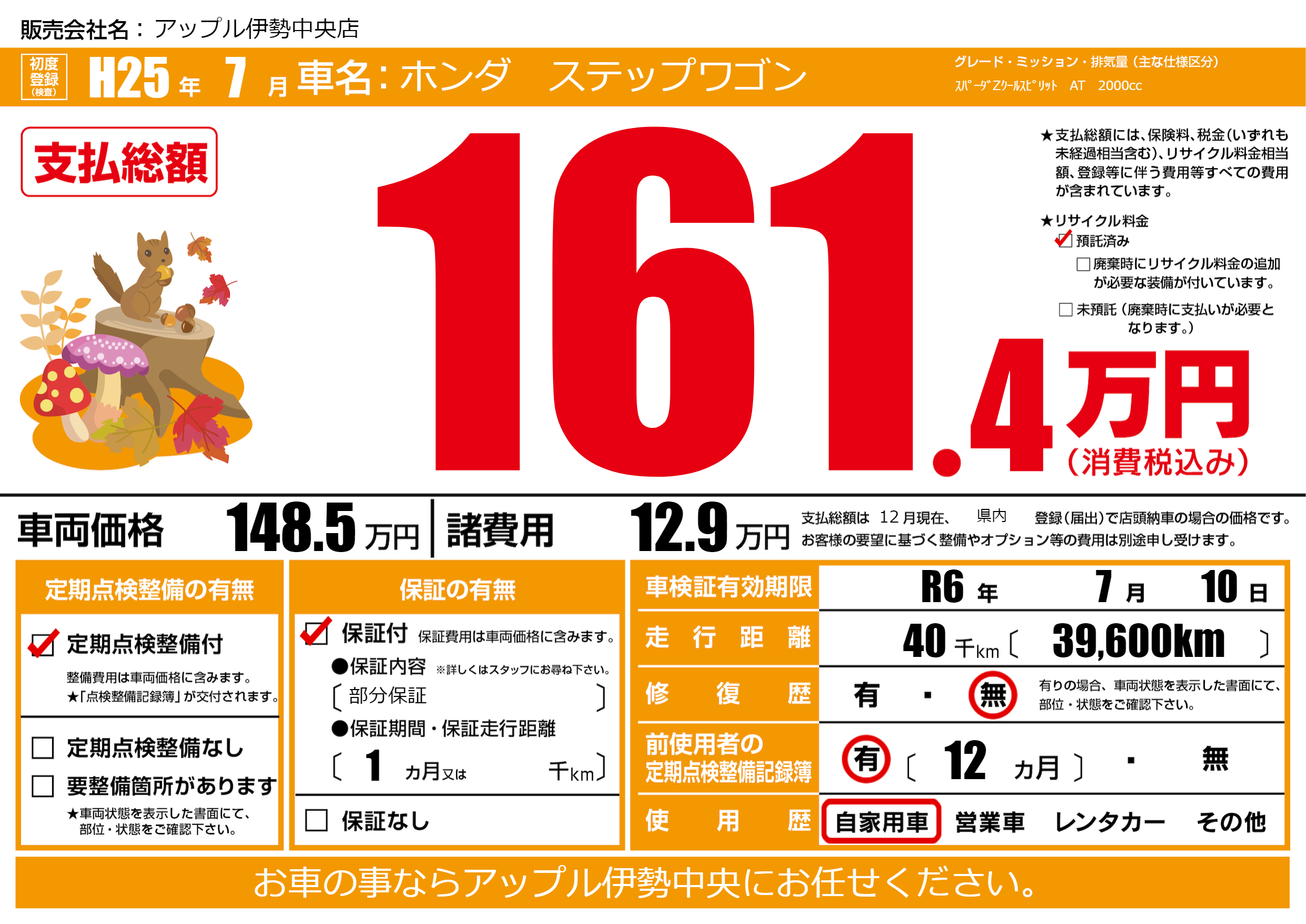 | 走行キロ | 4万km | 初年度登録 | H25年7月 |