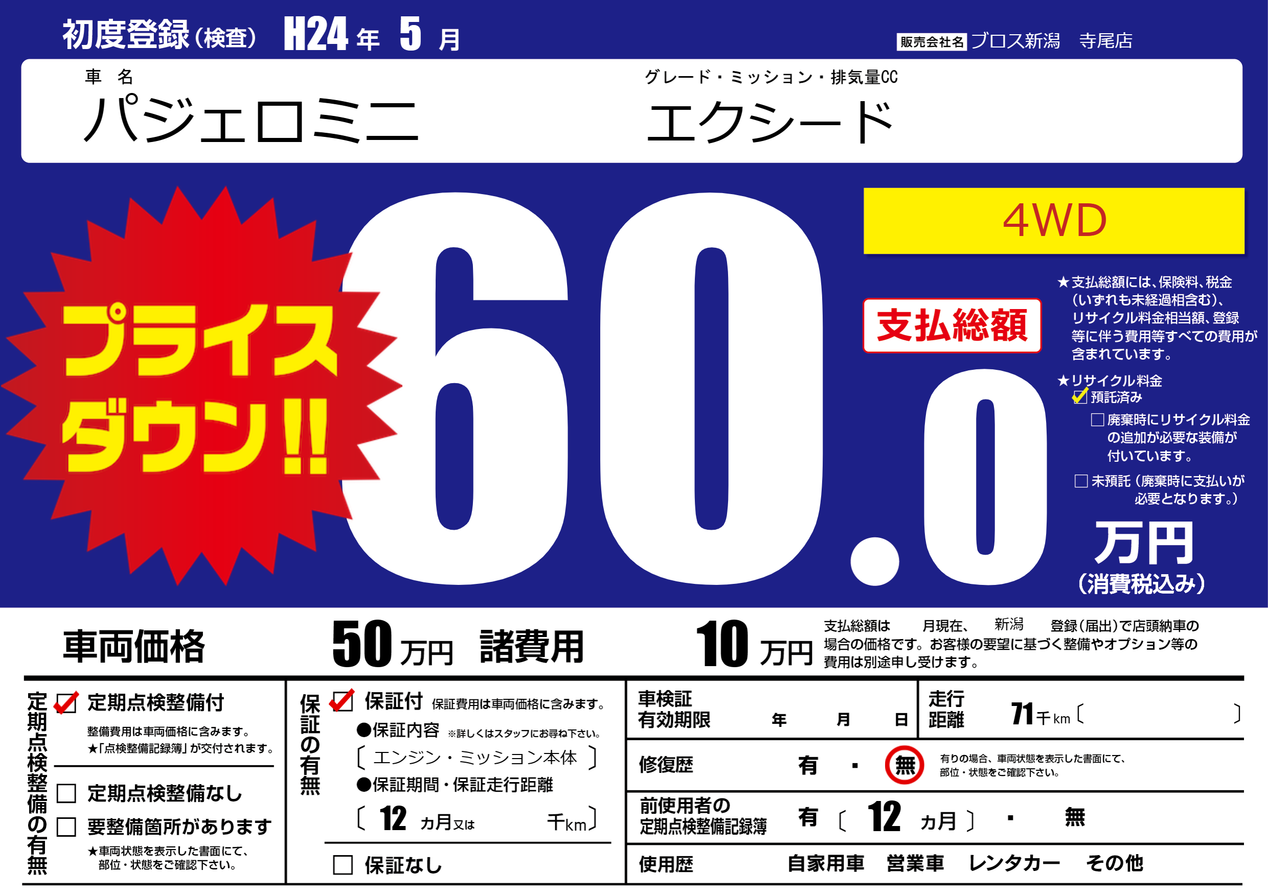 | 車名 | パジェロミニ | グレード ミッション 排気量 |