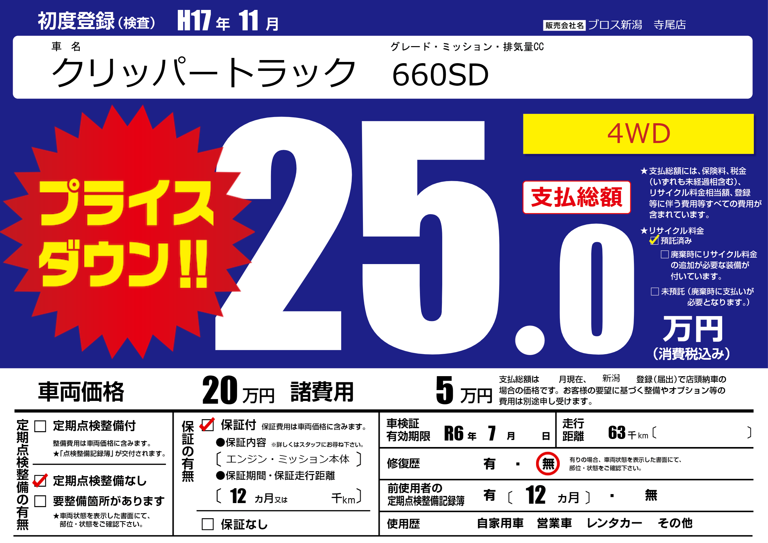 | 走行キロ | 6.3万km | 初年度登録 | H17年11月 |