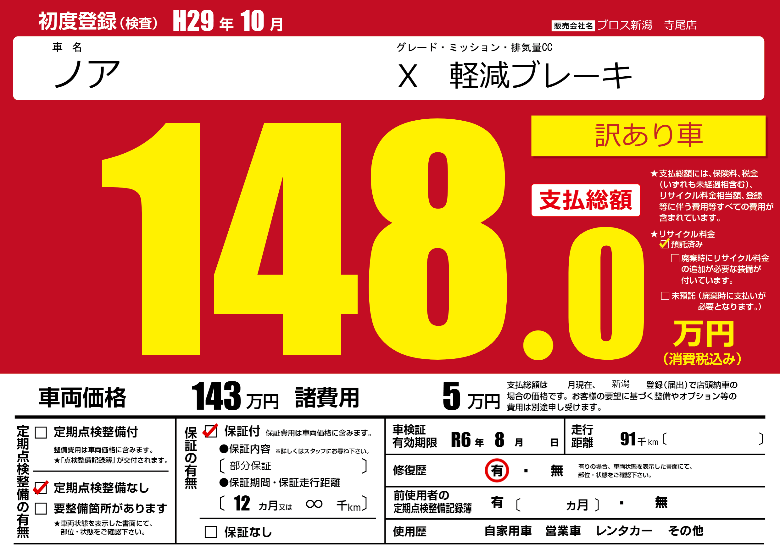 | 走行キロ | 9.1万km | 初年度登録 | H29年10月 |