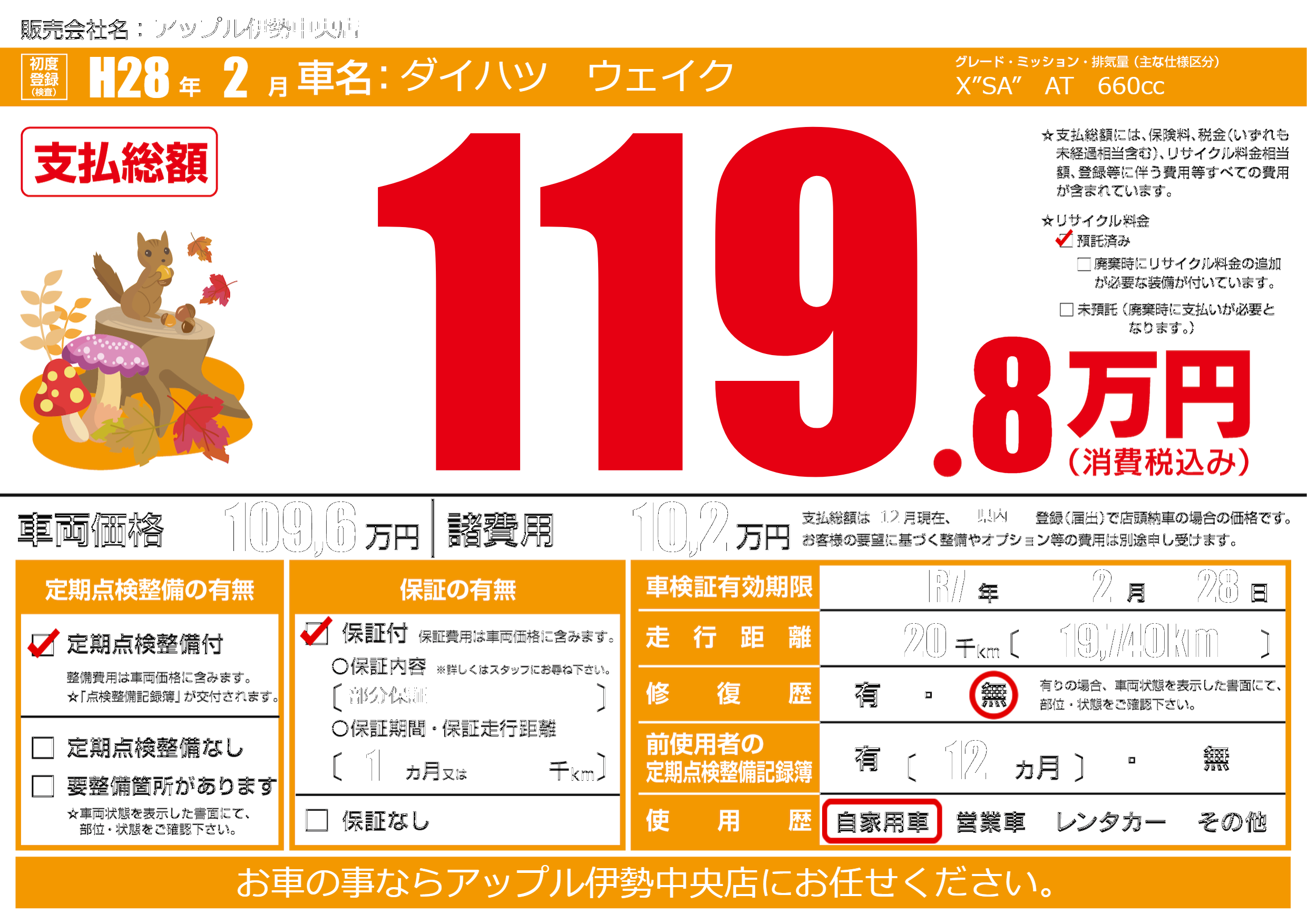 | 車名 | ダイハツ ウェイク | グレード ミッション 排気量 |