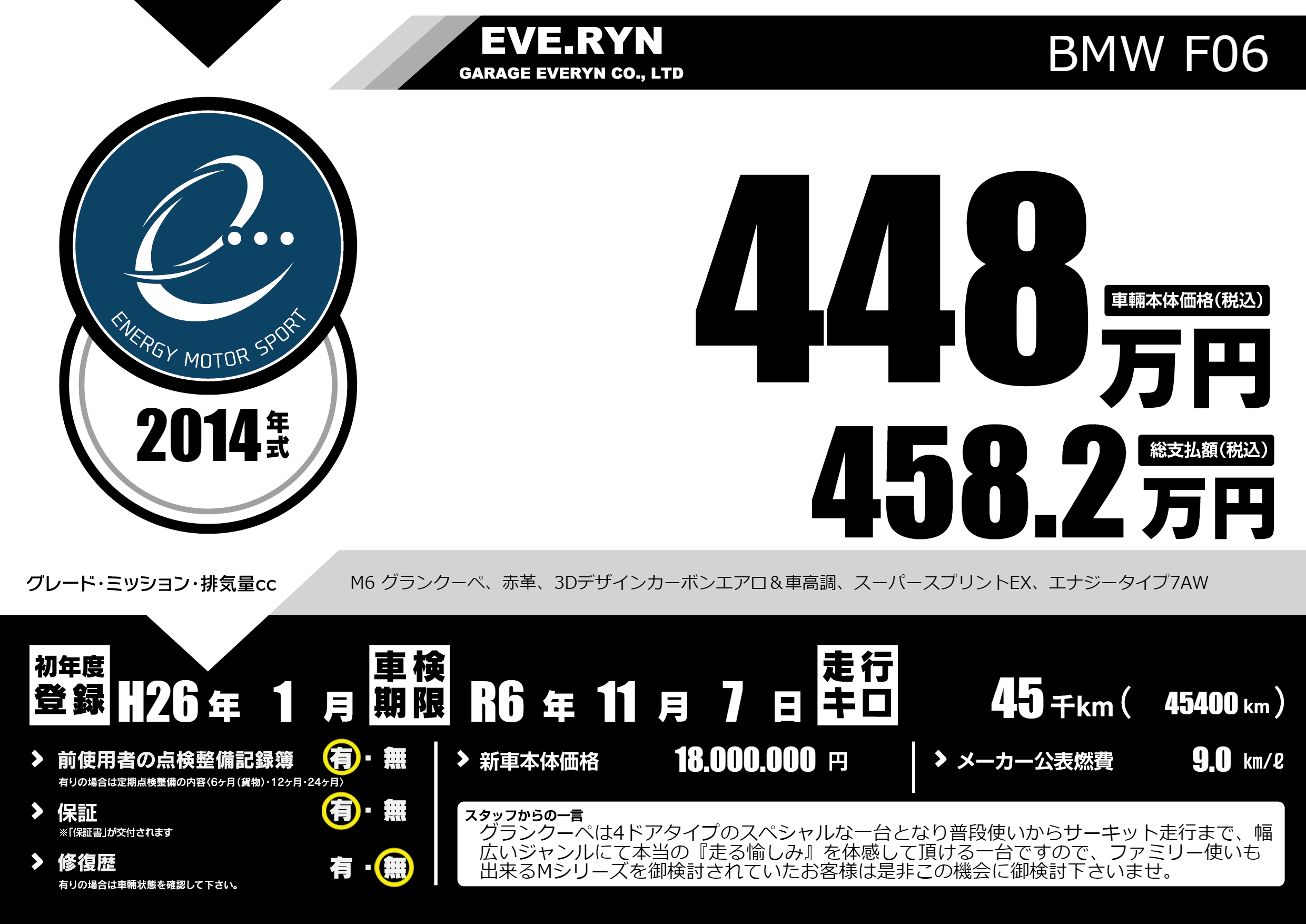 M6 グランクーペ、赤革、3Dデザインカーボンエアロ&車高調、スーパースプリントEX、エナジータイプ7AW |