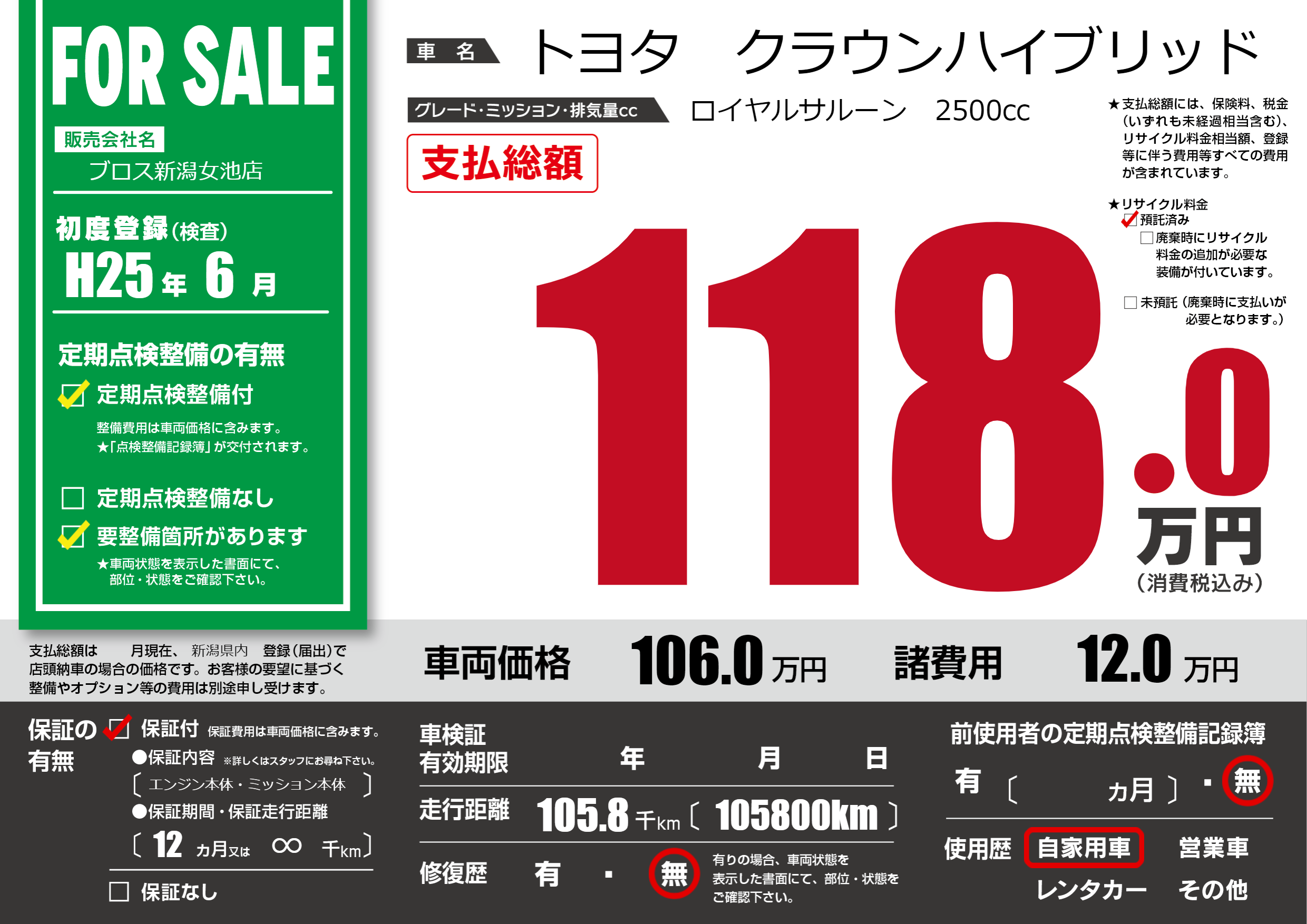 | 車名 | トヨタ クラウンハイブリッド | グレード ミッション 排気量 |