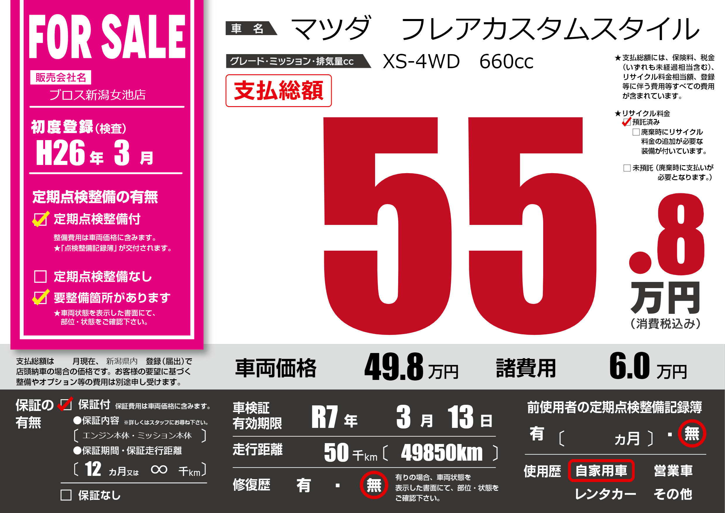| 車名 | マツダ フレアカスタムスタイル | グレード ミッション 排気量 |