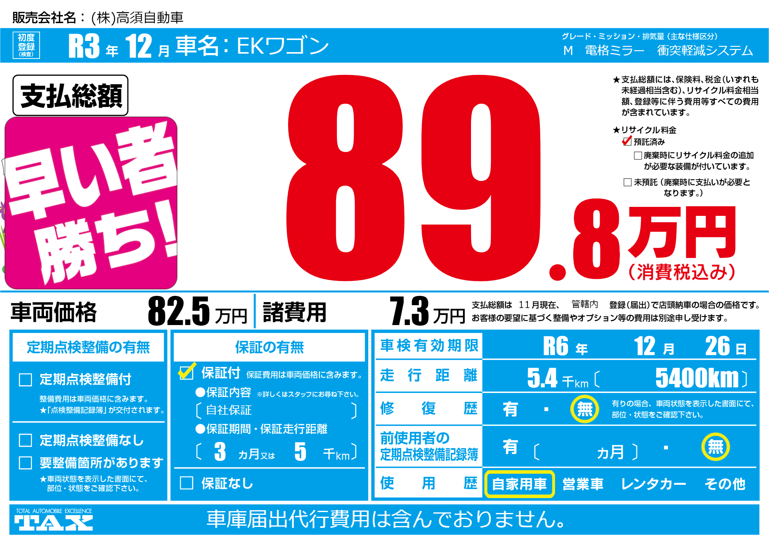 | 車名 | EKワゴン | グレード ミッション 排気量 |