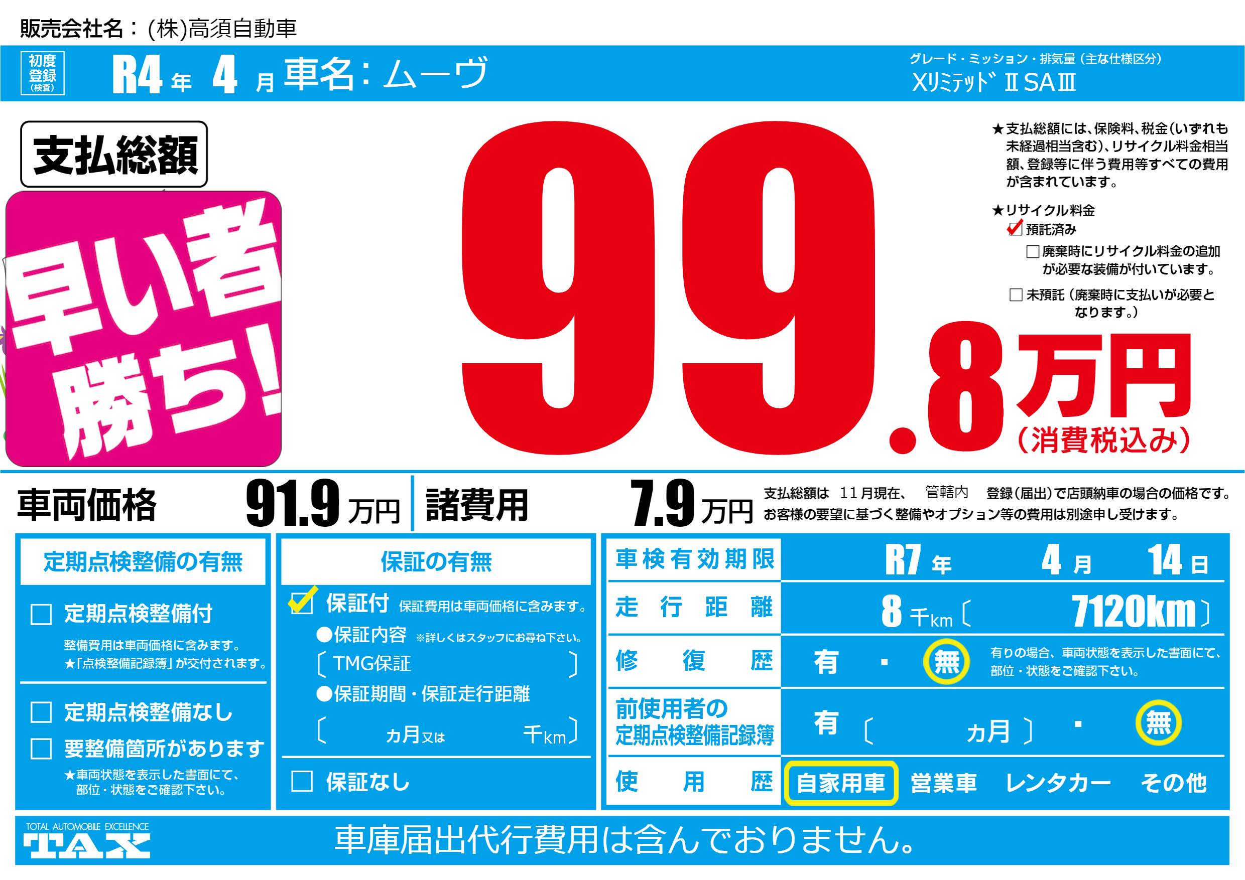 | 車名 | ムーヴ | グレード ミッション 排気量 |