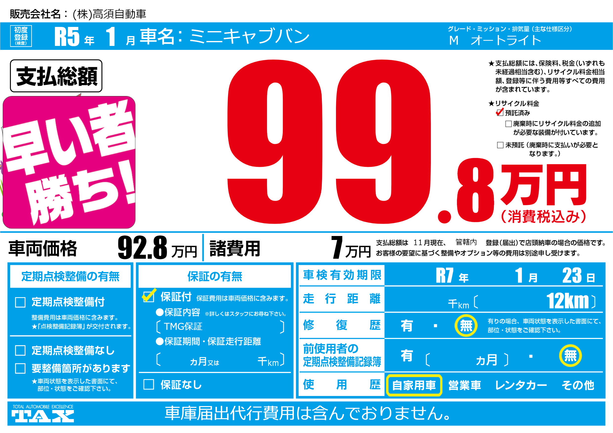 保証付き 保証内容(TMG保証) ---ヶ月または()千kmまで |
