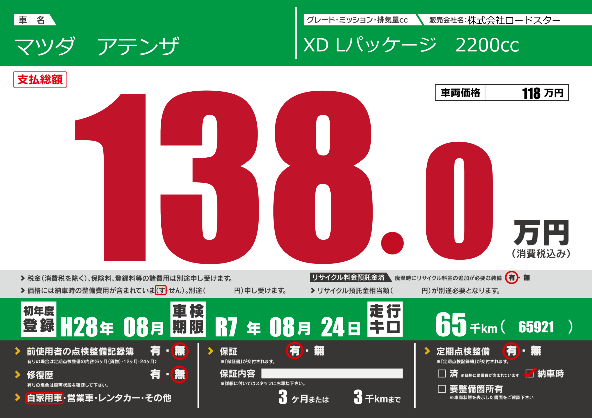 | 定期点検整備 | 定期点検整備あり 納車時あり | ||