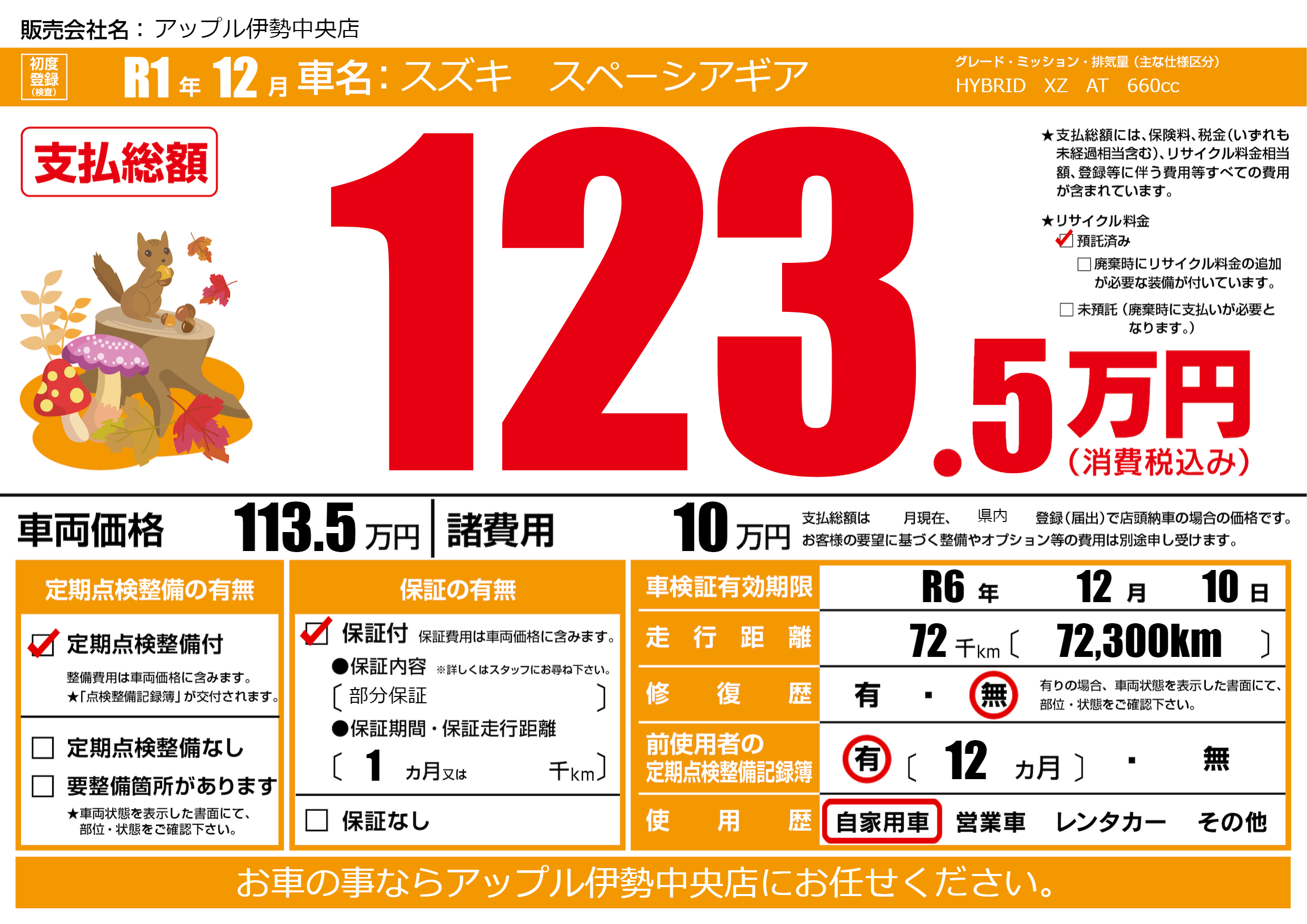 | 車名 | スズキ スペーシアギア | グレード ミッション 排気量 |