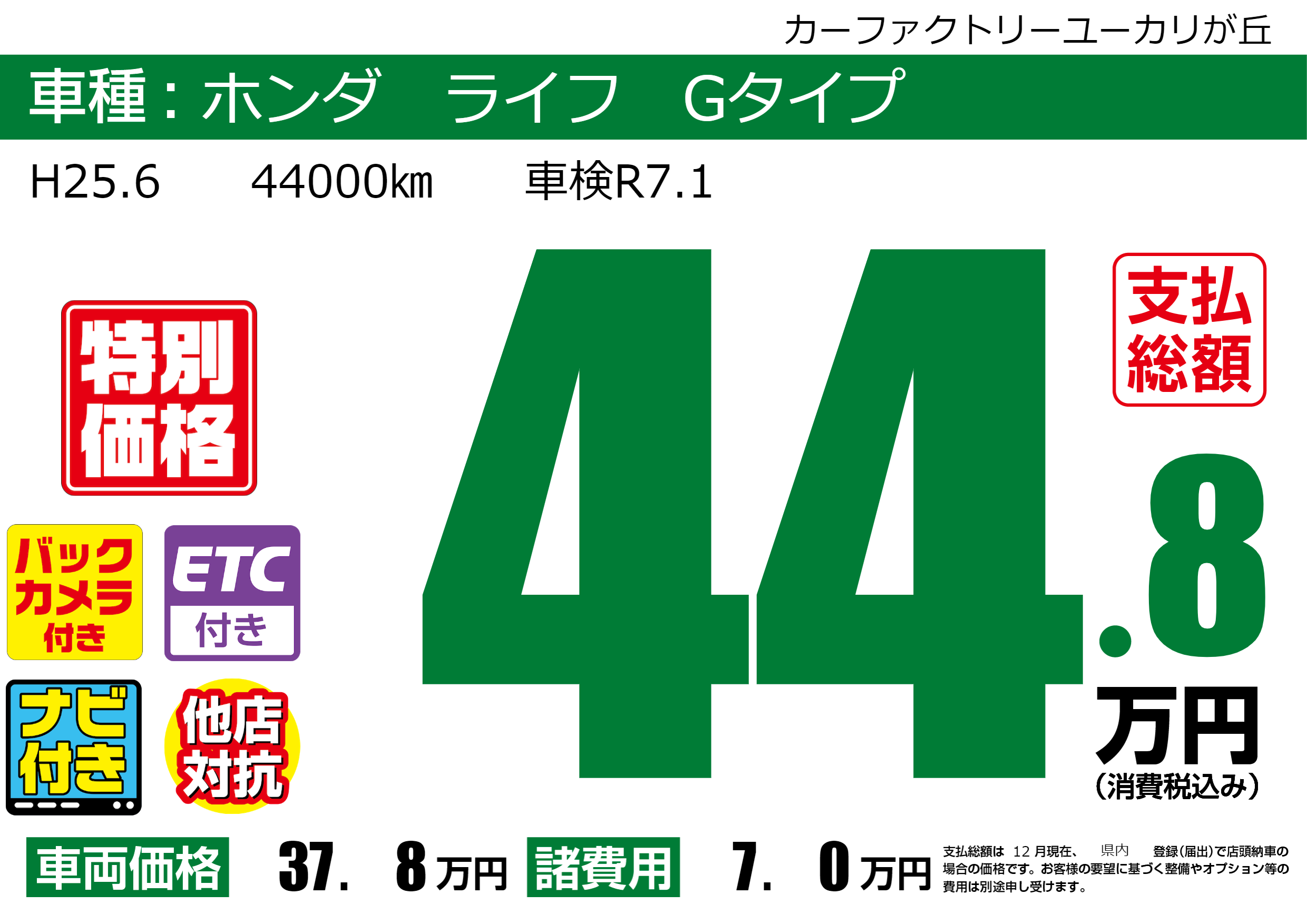 | 車名 | ホンダ ライフ Gタイプ | グレード ミッション 排気量 |