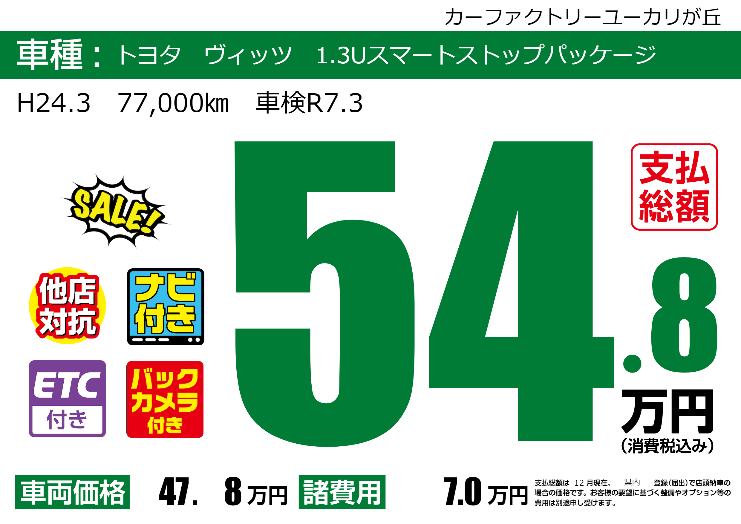 | 車名 | トヨタ ヴィッツ 1.3Uスマートストップパッケージ | グレード ミッション 排気量 |