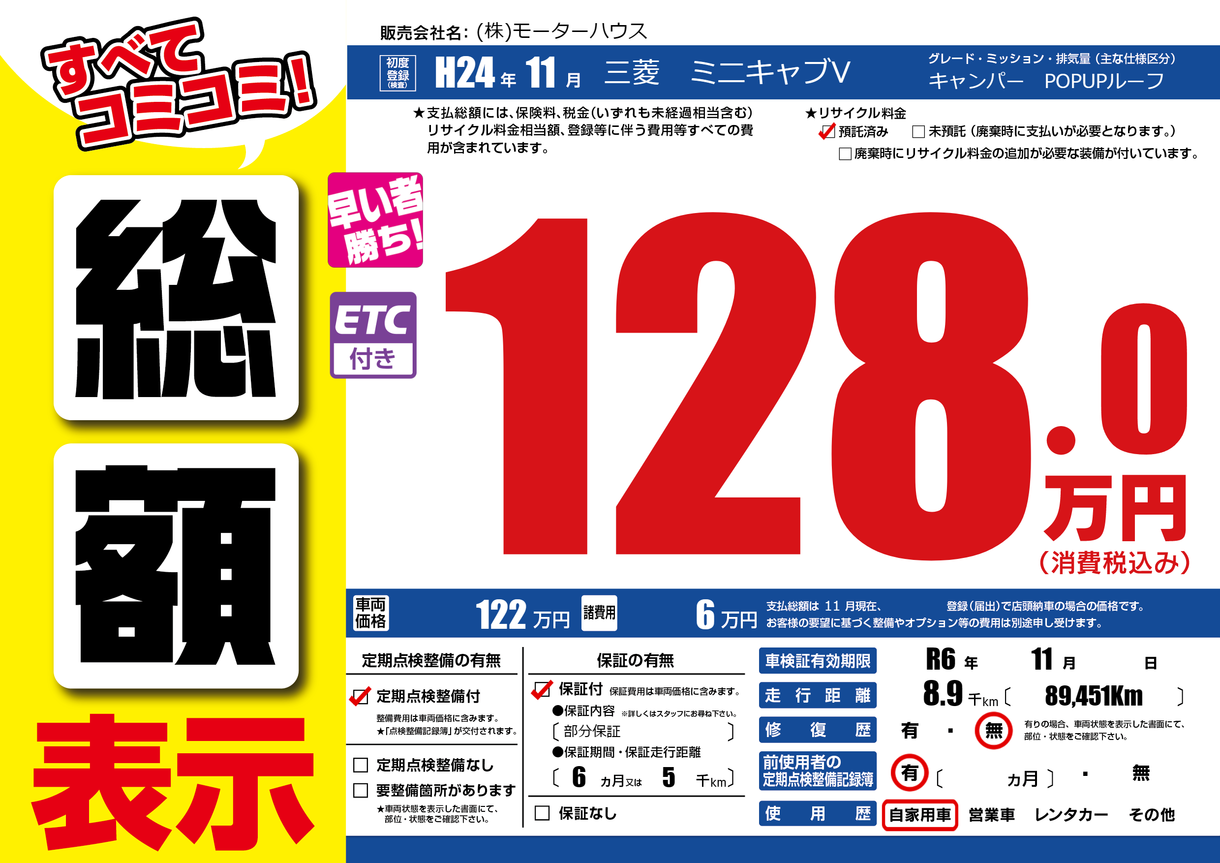 | 車名 | 三菱 ミニキャブV | グレード ミッション 排気量 |