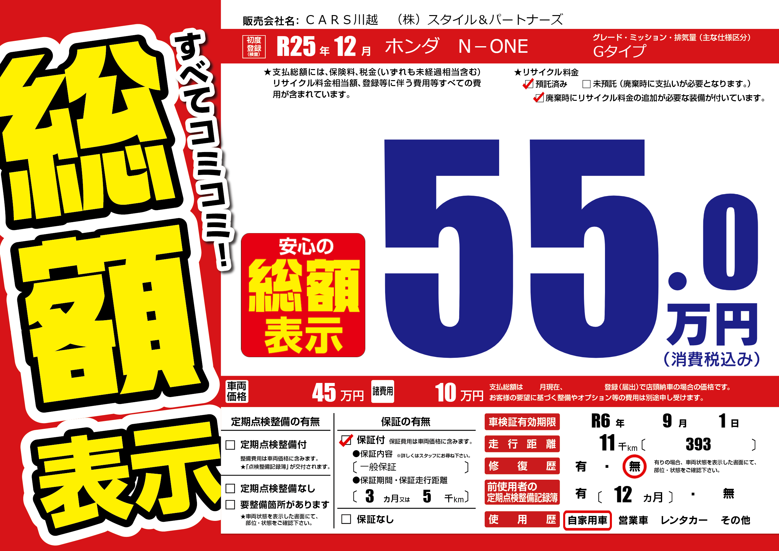 | 車名 | ホンダ N-ONE | グレード ミッション 排気量 |