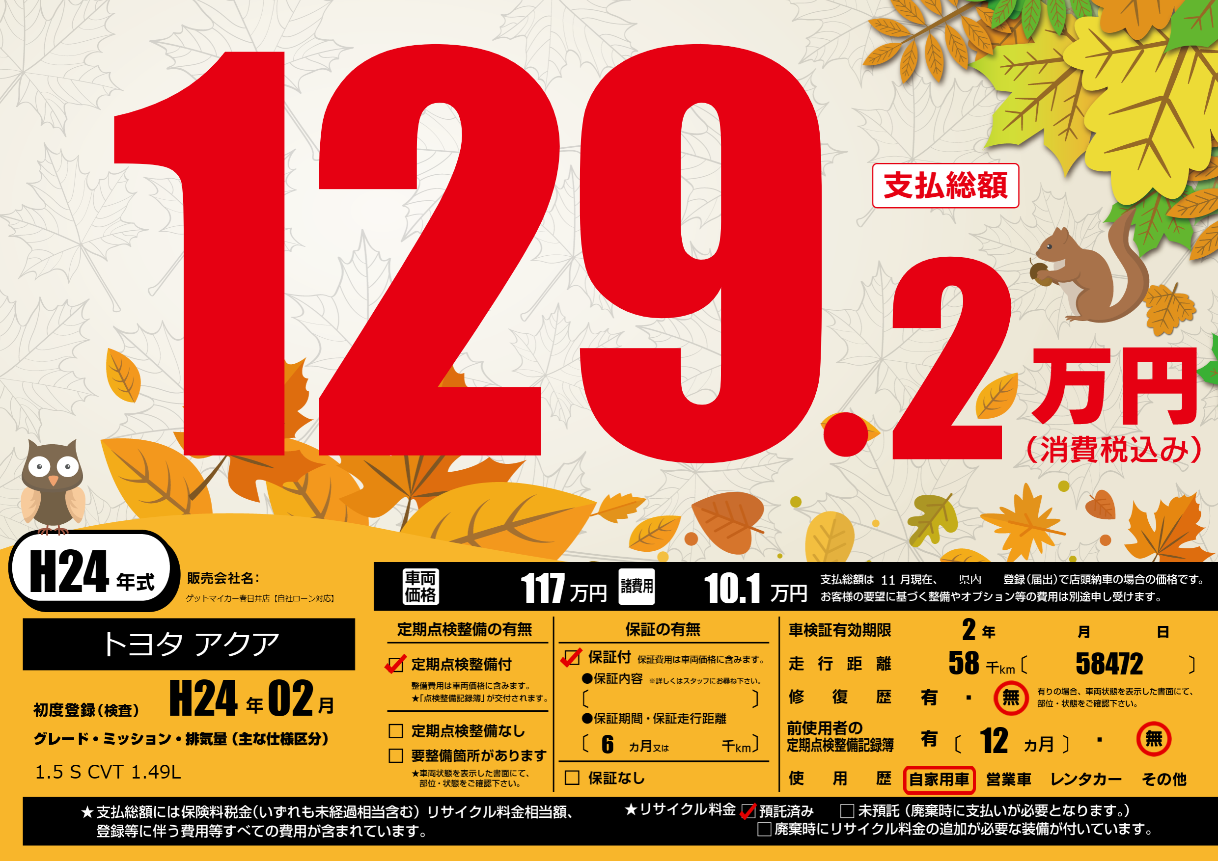 | 車名 | トヨタ アクア | グレード ミッション 排気量 |