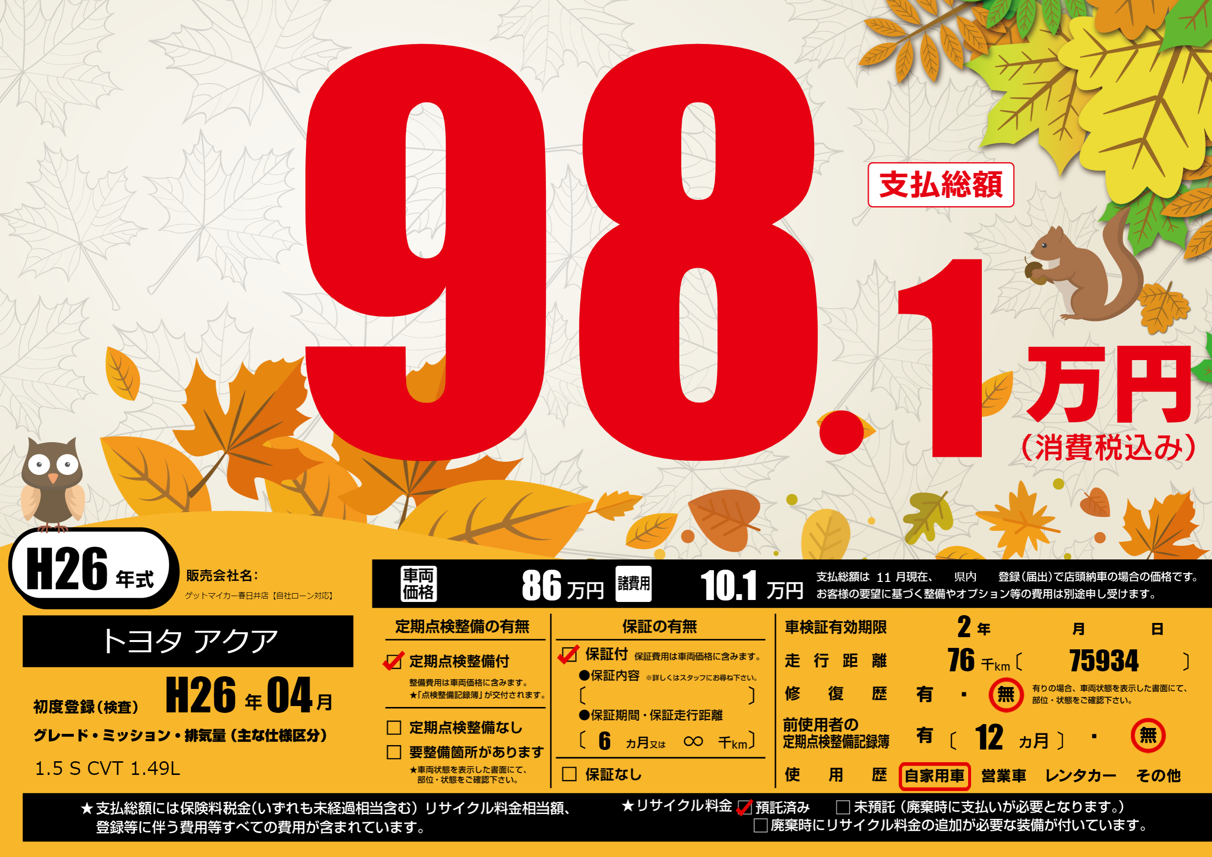 | 車名 | トヨタ アクア | グレード ミッション 排気量 |