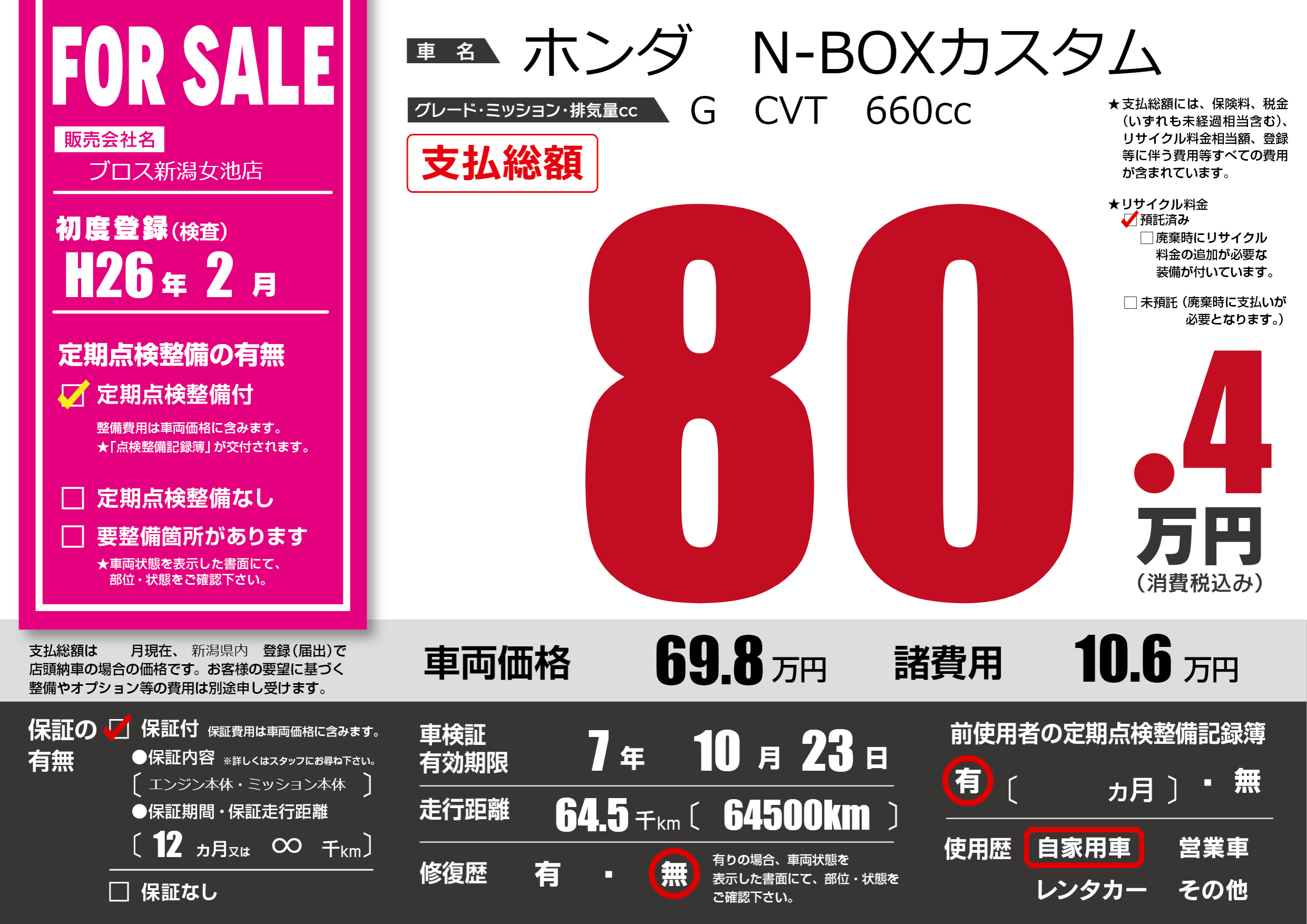 | 車名 | ホンダ N-BOXカスタム | グレード ミッション 排気量 |