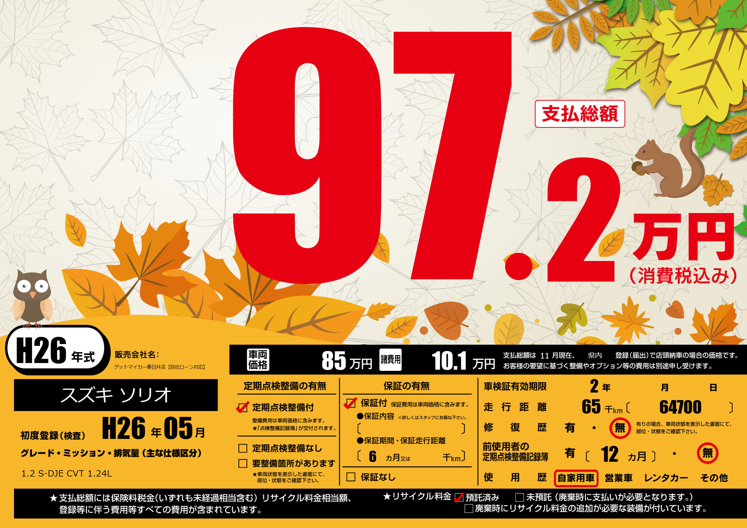 | 車名 | スズキ ソリオ | グレード ミッション 排気量 |