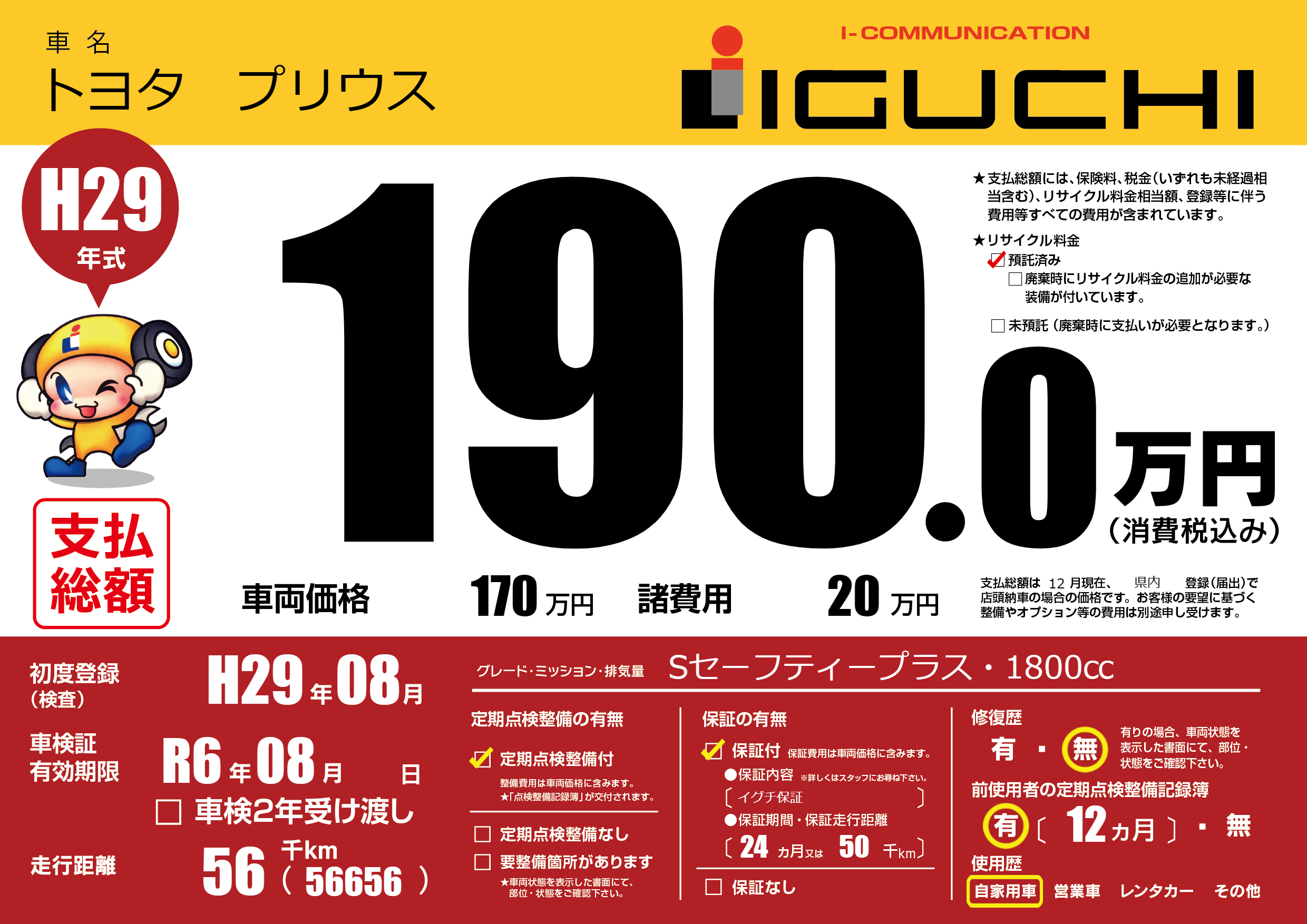 | 車名 | トヨタ プリウス | グレード ミッション 排気量 |