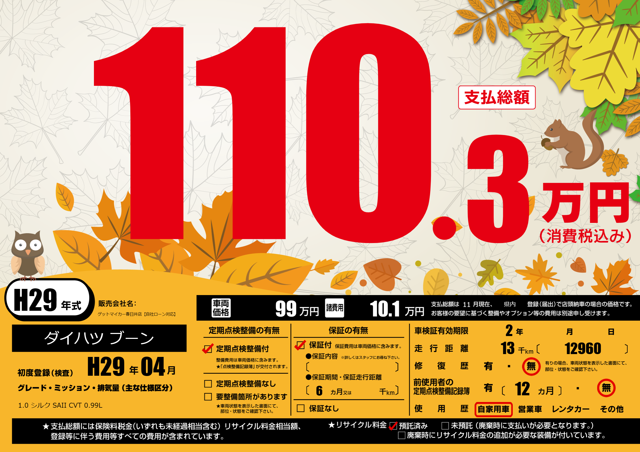 | 車名 | ダイハツ ブーン | グレード ミッション 排気量 |