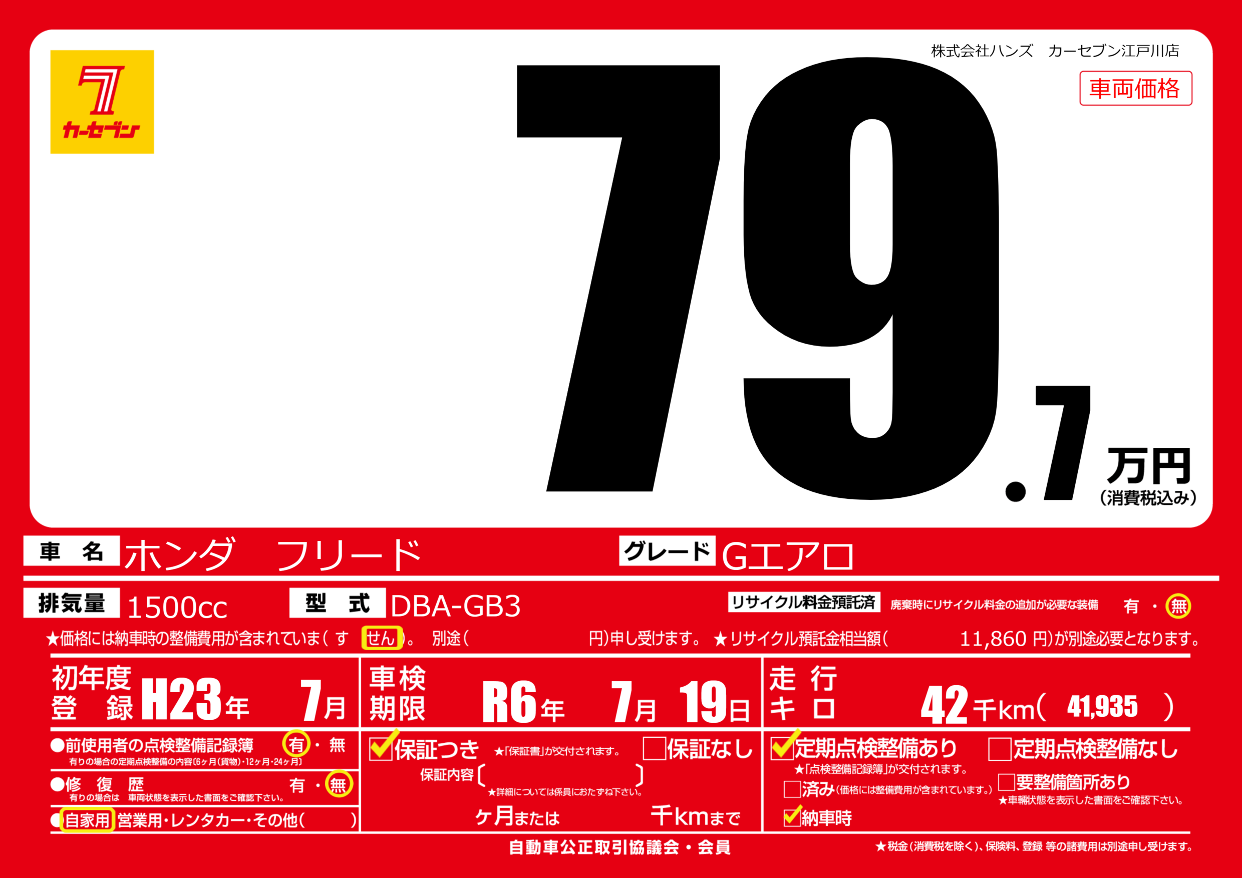 | 走行キロ | 4.2万km | 初年度登録 | H23年7月 |