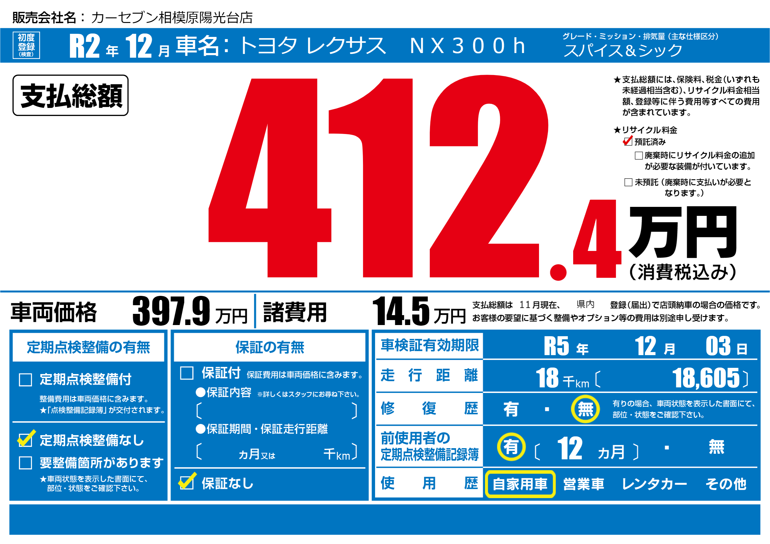 | 車検制限 | R5年 12月 03日 | ||