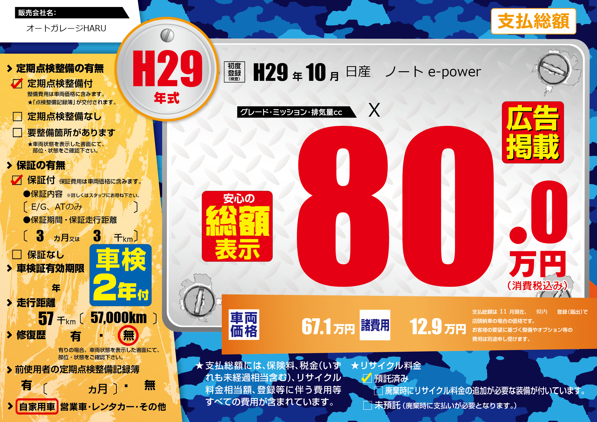 | 車名 | 日産 ノート e-power | グレード ミッション 排気量 |