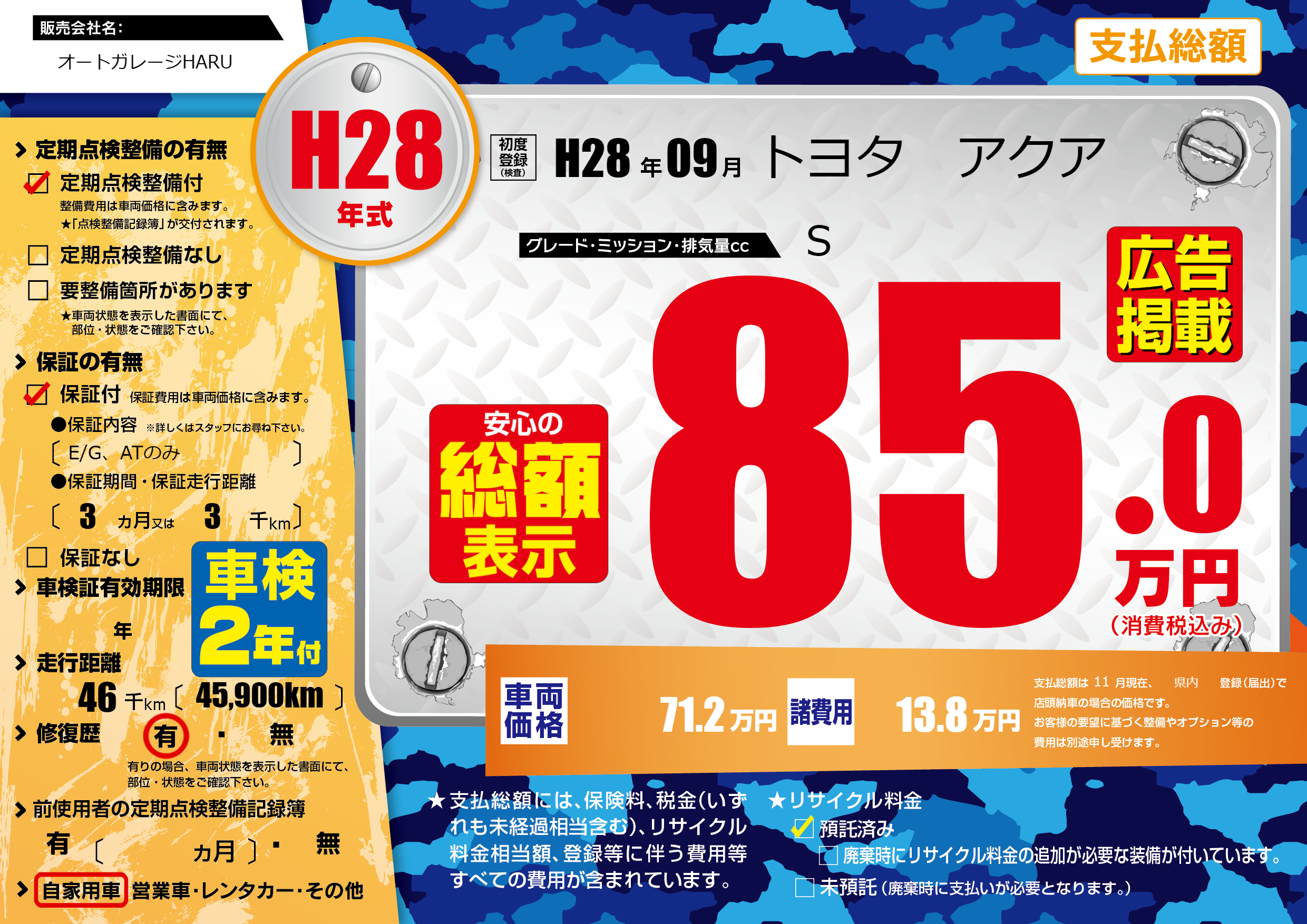 | 走行キロ | 4.6万km | 初年度登録 | H28年09月 |