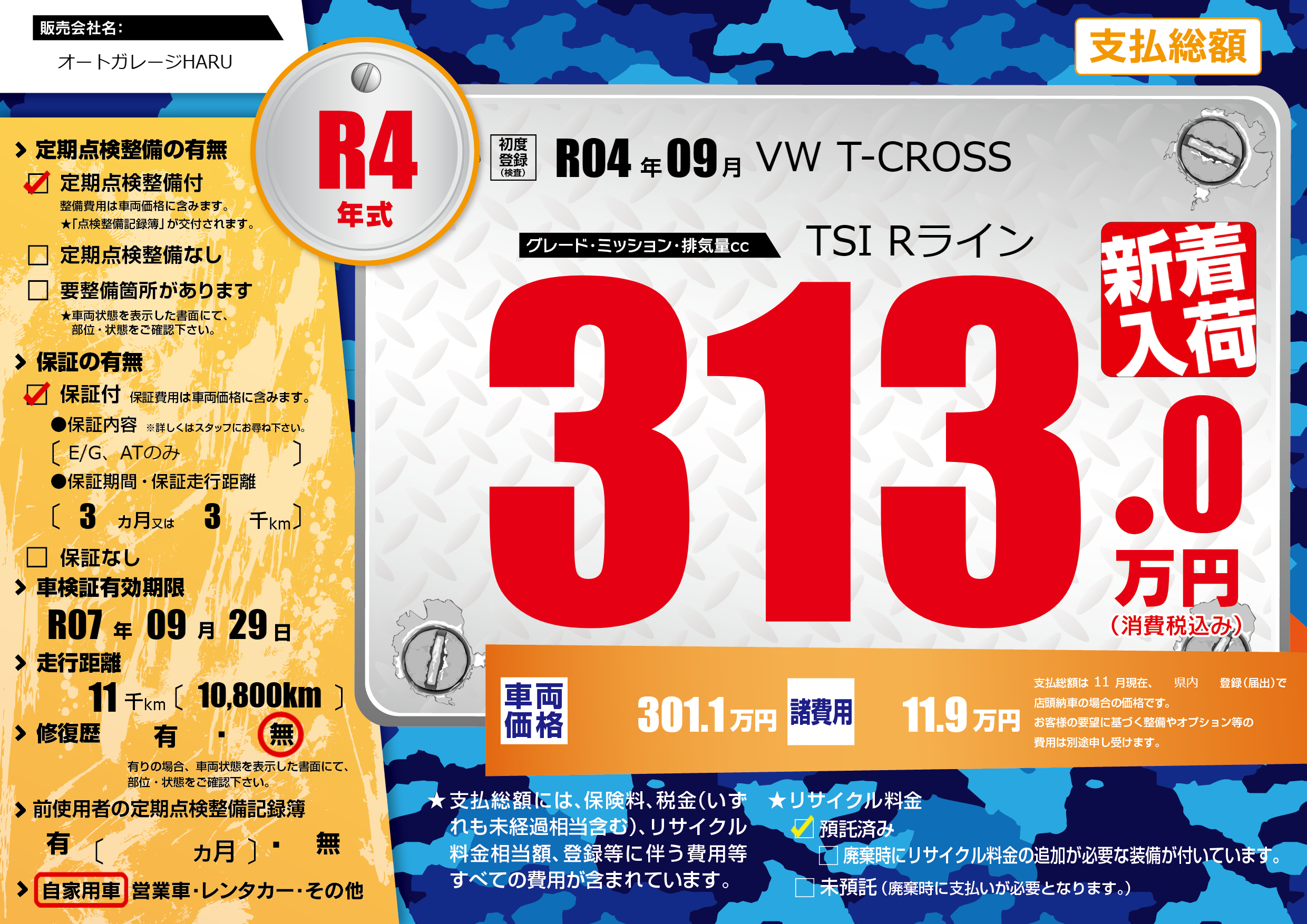 | 車名 | VW T-CROSS | グレード ミッション 排気量 |