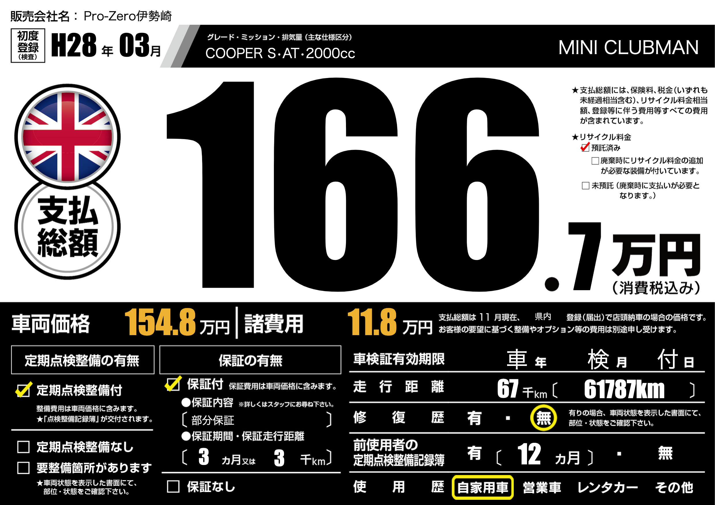 | 車名 | MINI CLUBMAN | グレード ミッション 排気量 |
