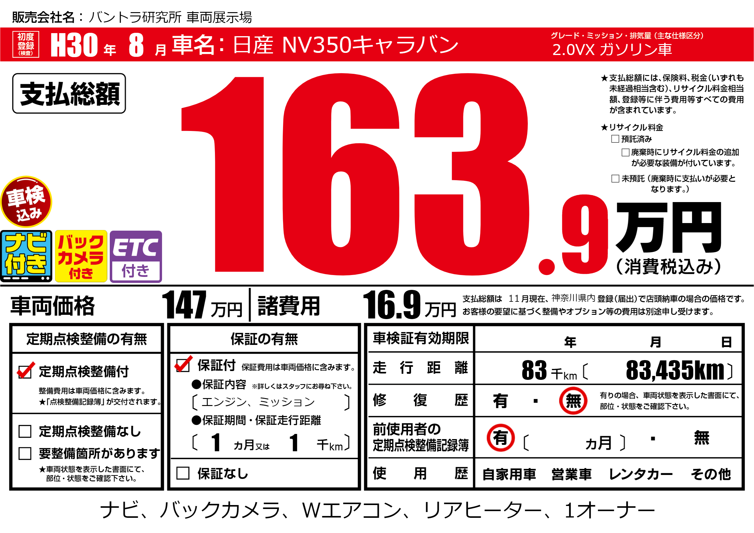 | 車名 | 日産 NV350キャラバン | グレード ミッション 排気量 |
