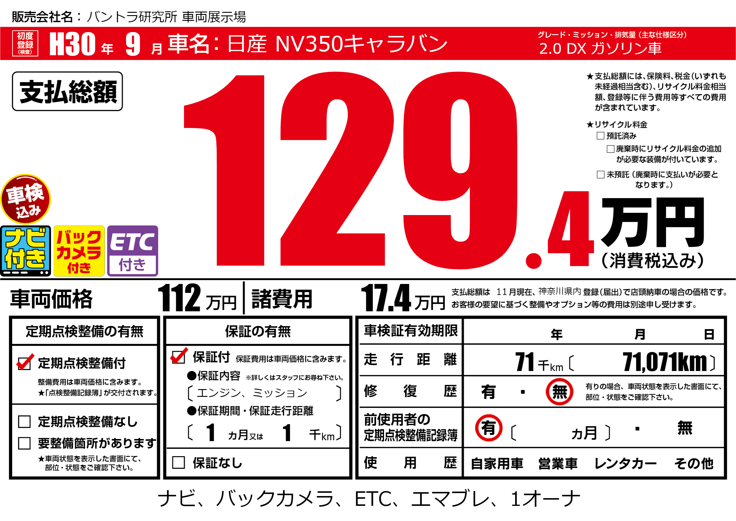 | 走行キロ | 7.1万km | 初年度登録 | H30年9月 |