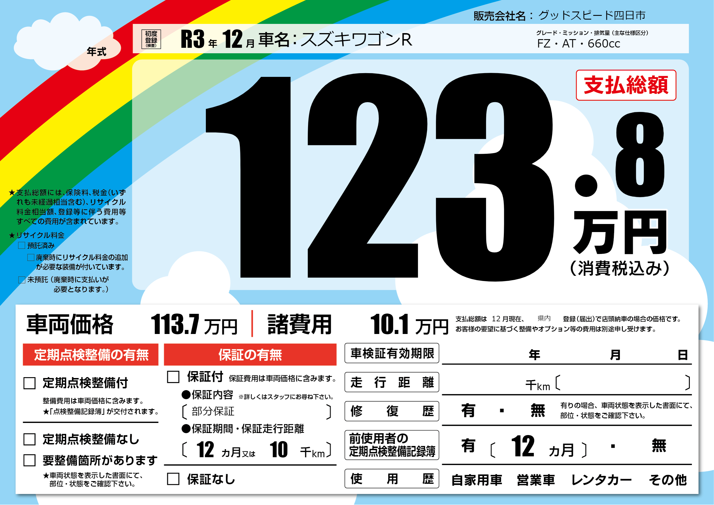 | 車名 | スズキワゴンR | グレード ミッション 排気量 |