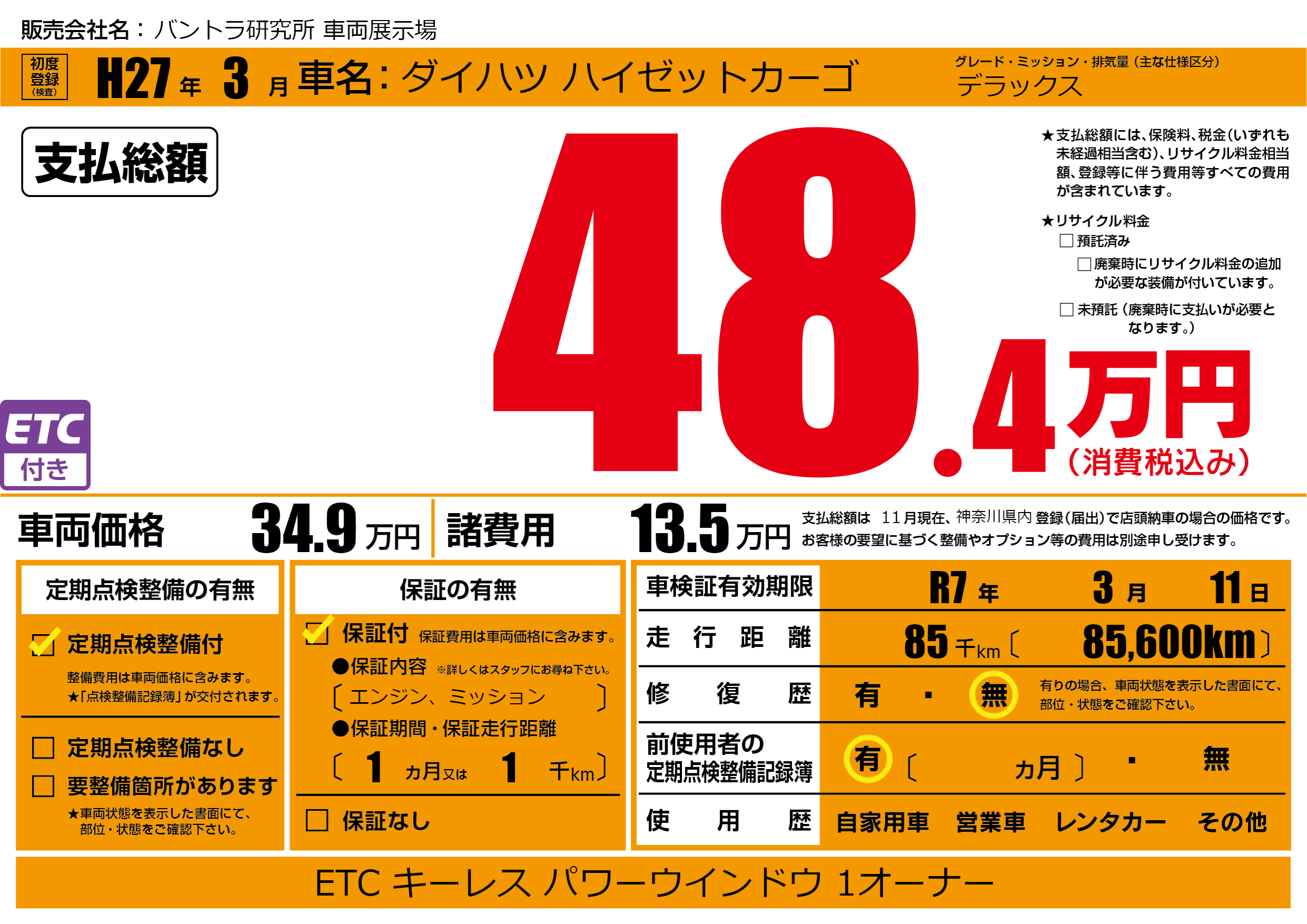 | 車名 | ダイハツ ハイゼットカーゴ | グレード ミッション 排気量 |