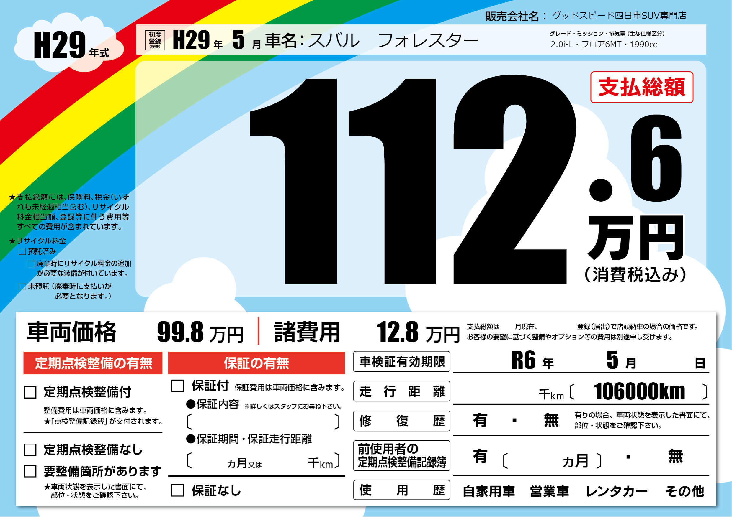 | 車名 | スバル フォレスター | グレード ミッション 排気量 |