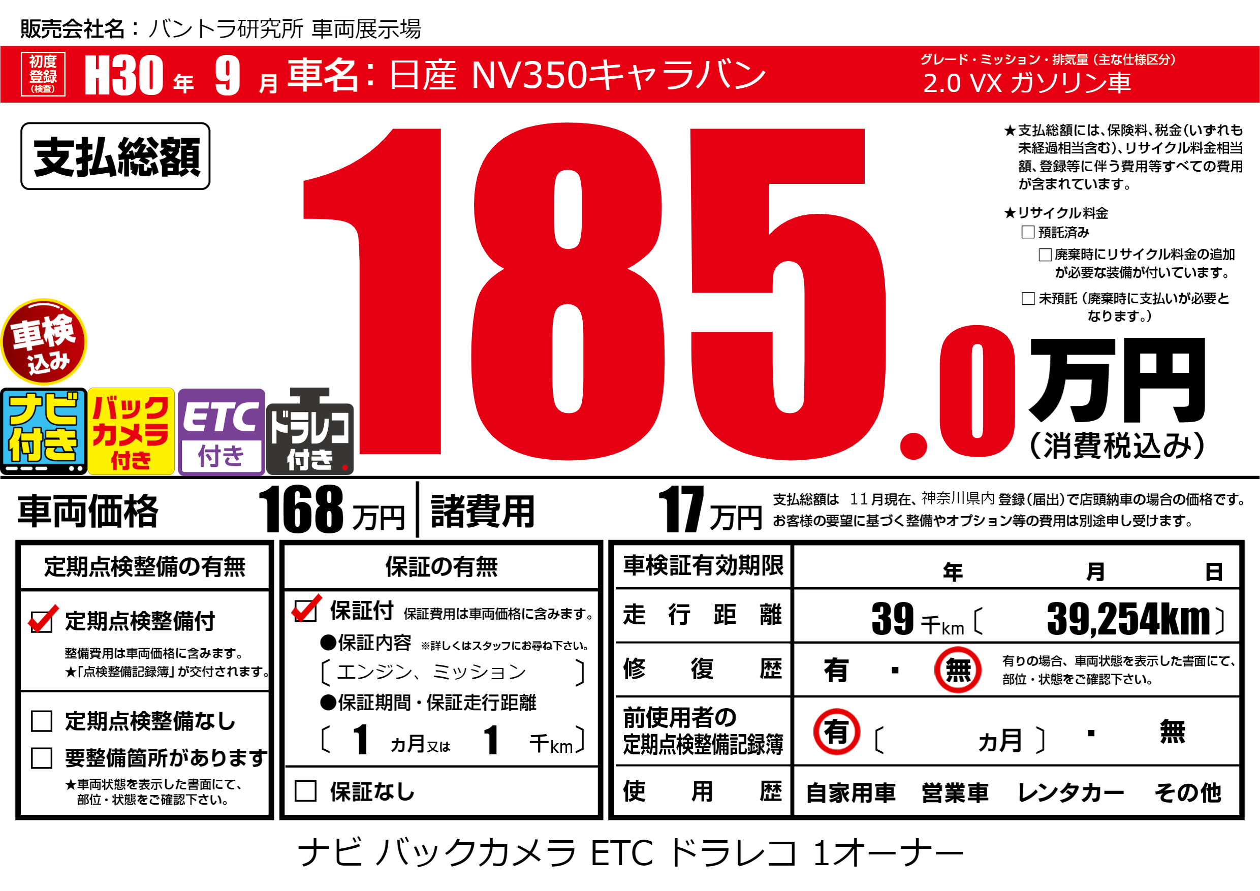 | 車名 | 日産 NV350キャラバン | グレード ミッション 排気量 |