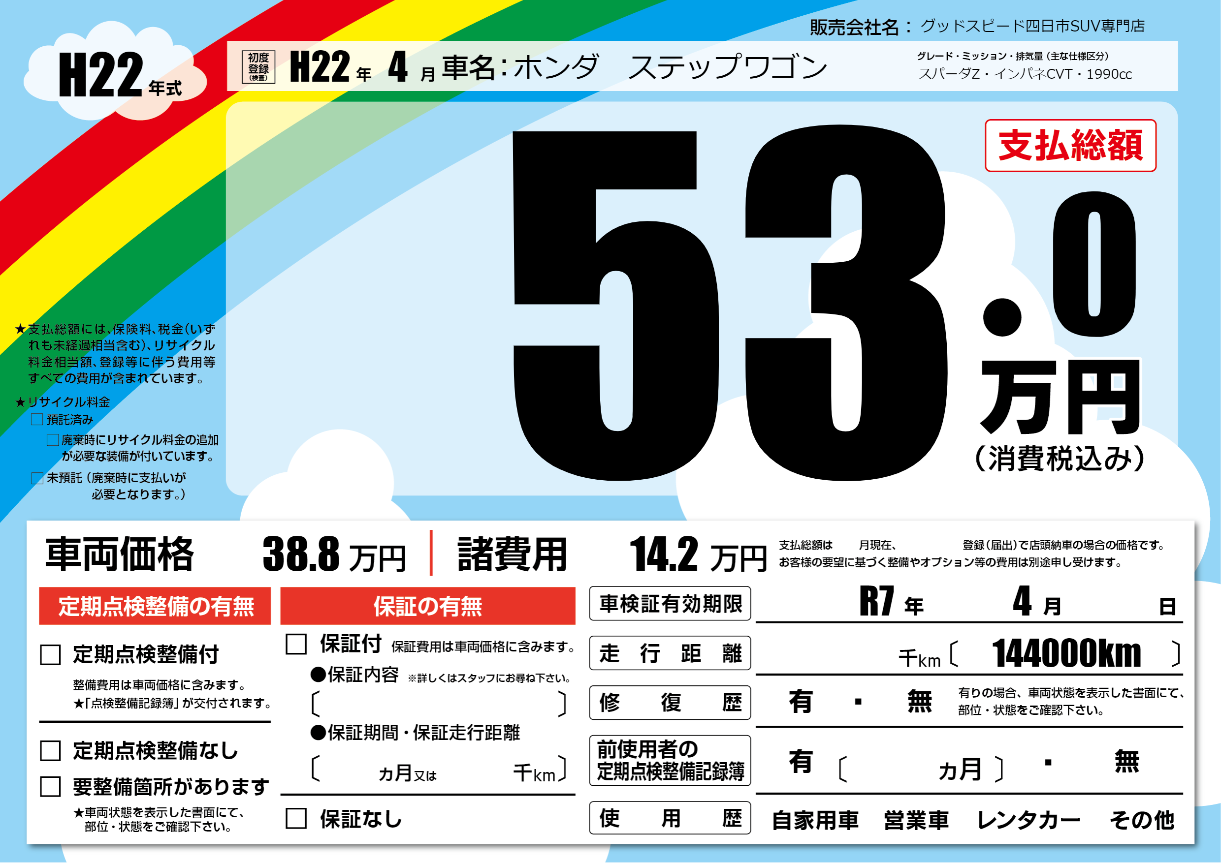 | 車名 | ホンダ ステップワゴン | グレード ミッション 排気量 |