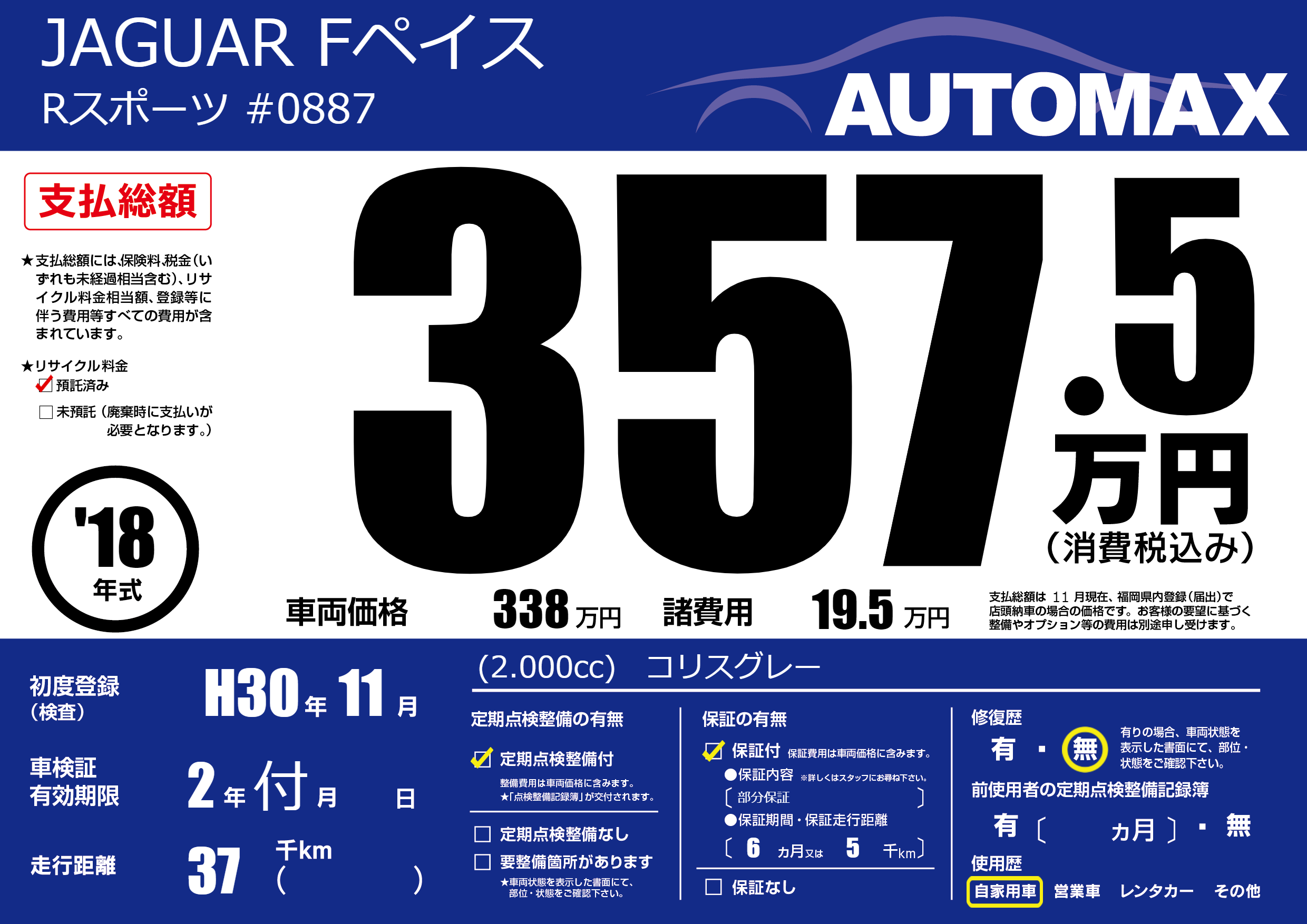 | 車名 | JAGUAR Fペイス | グレード ミッション 排気量 |