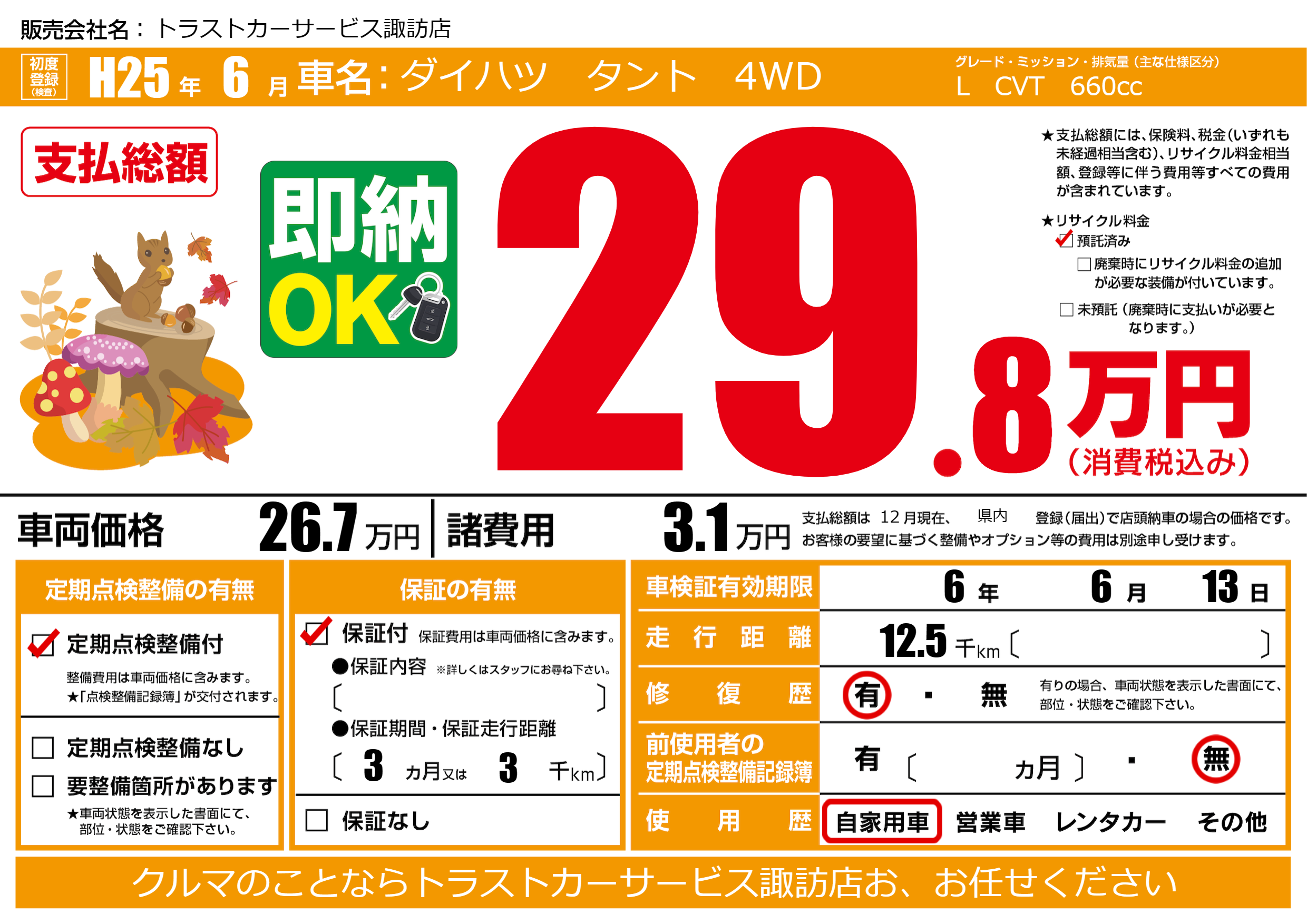 | 車名 | ダイハツ タント 4WD | グレード ミッション 排気量 |
