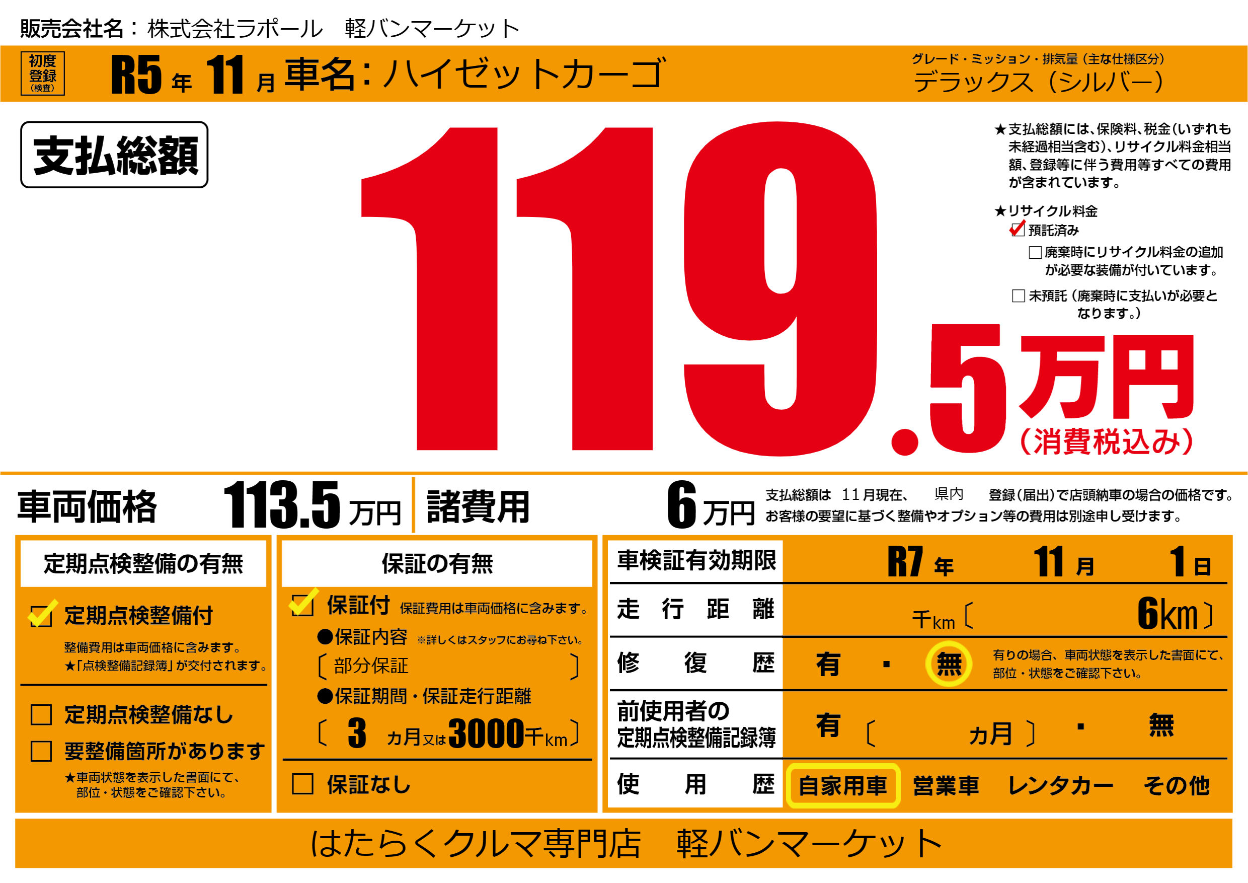 | 走行キロ | - | 初年度登録 | R5年11月 |