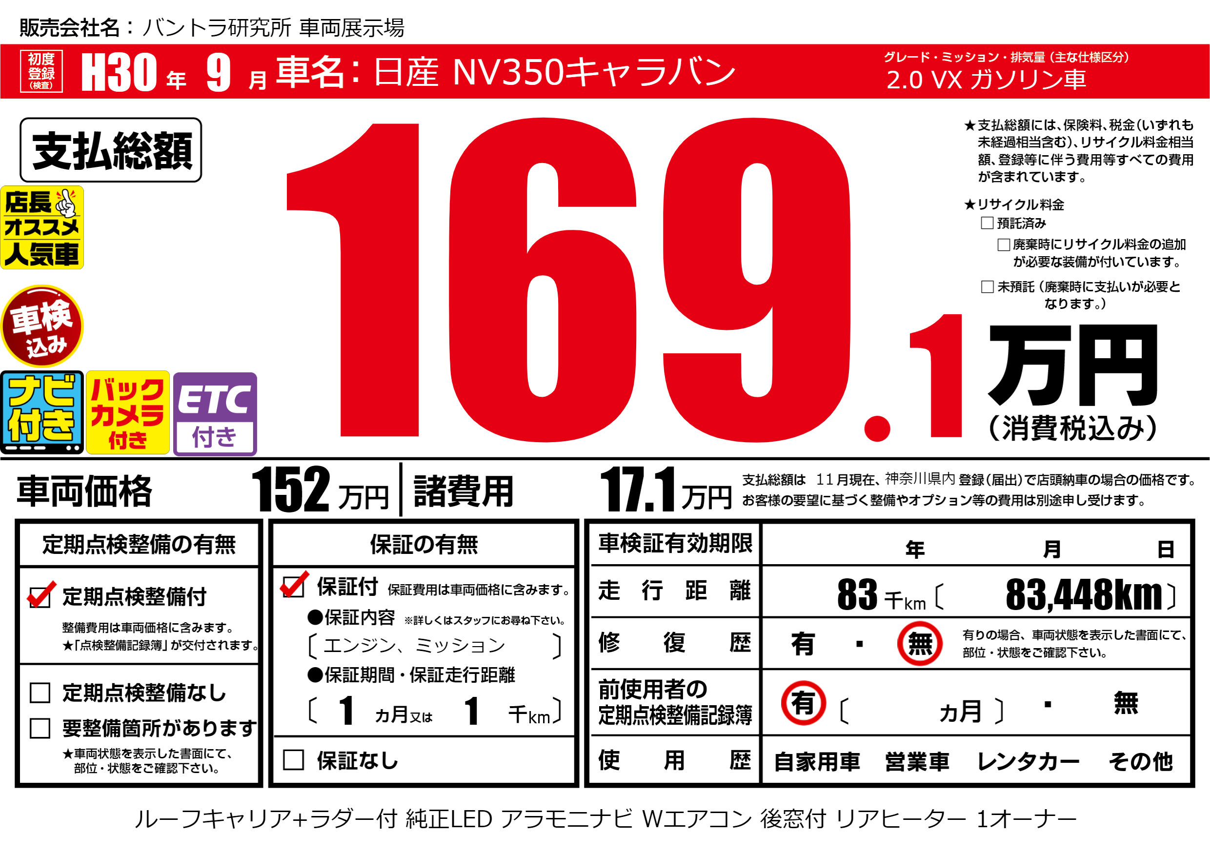 | 車名 | 日産 NV350キャラバン | グレード ミッション 排気量 |