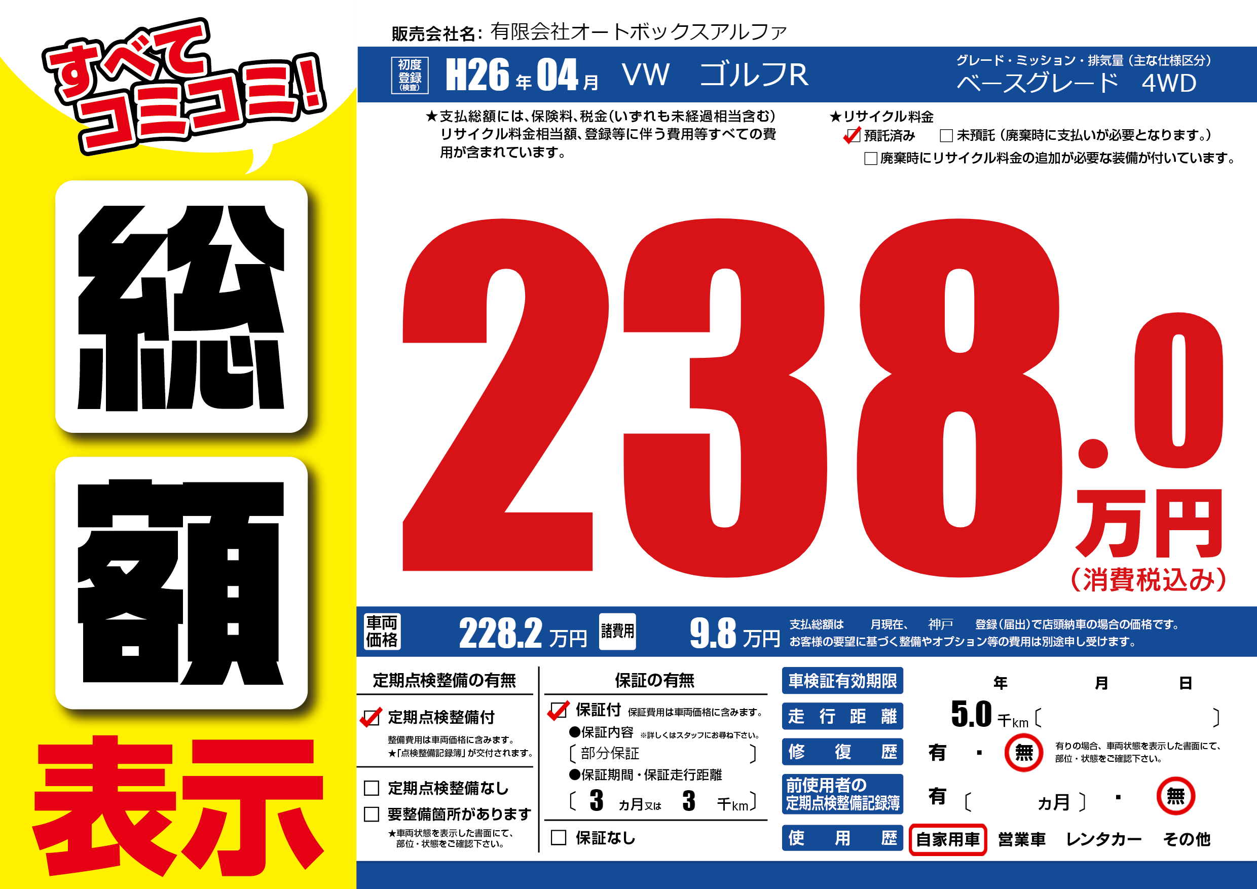 | 車名 | VW ゴルフR | グレード ミッション 排気量 |