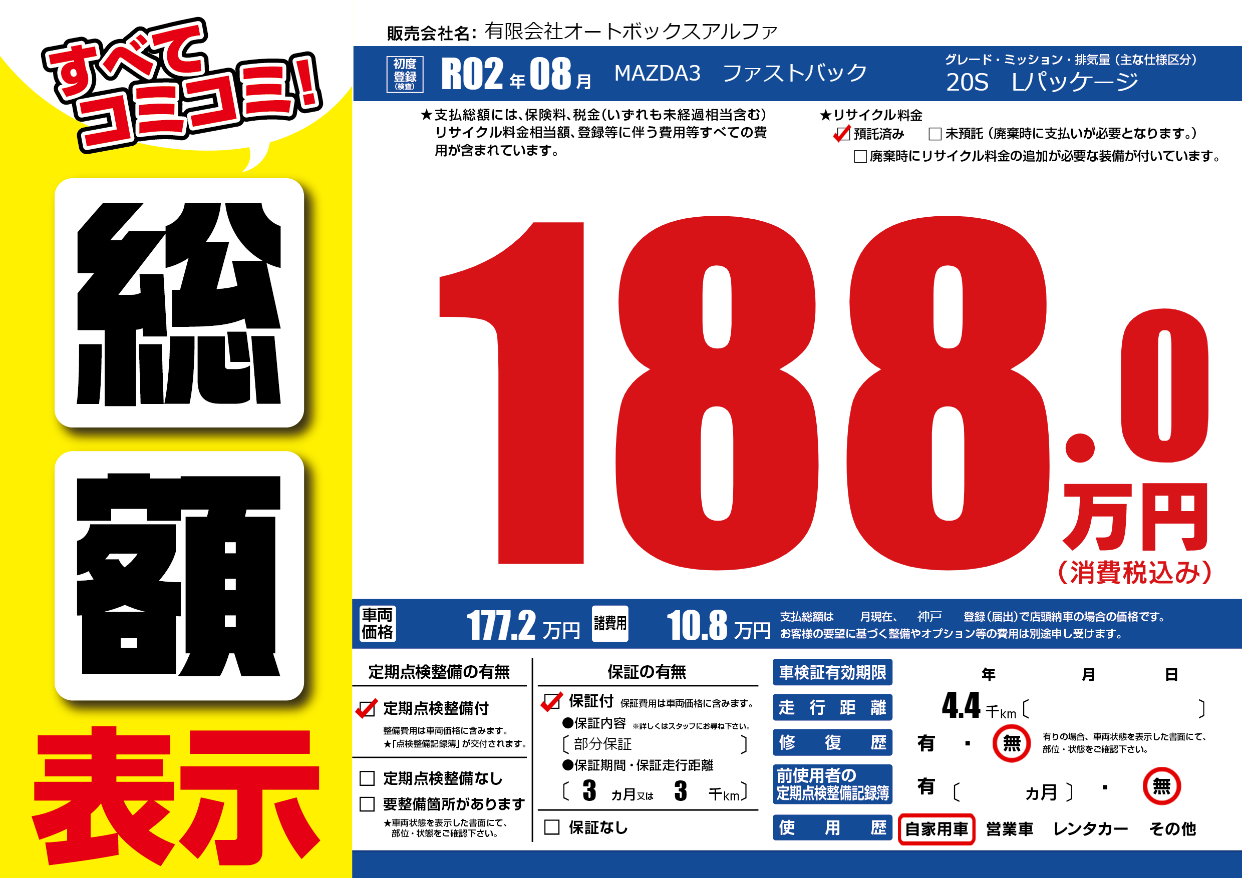 保証付き 保証内容(部分保証) 3ヶ月または(3)千kmまで |