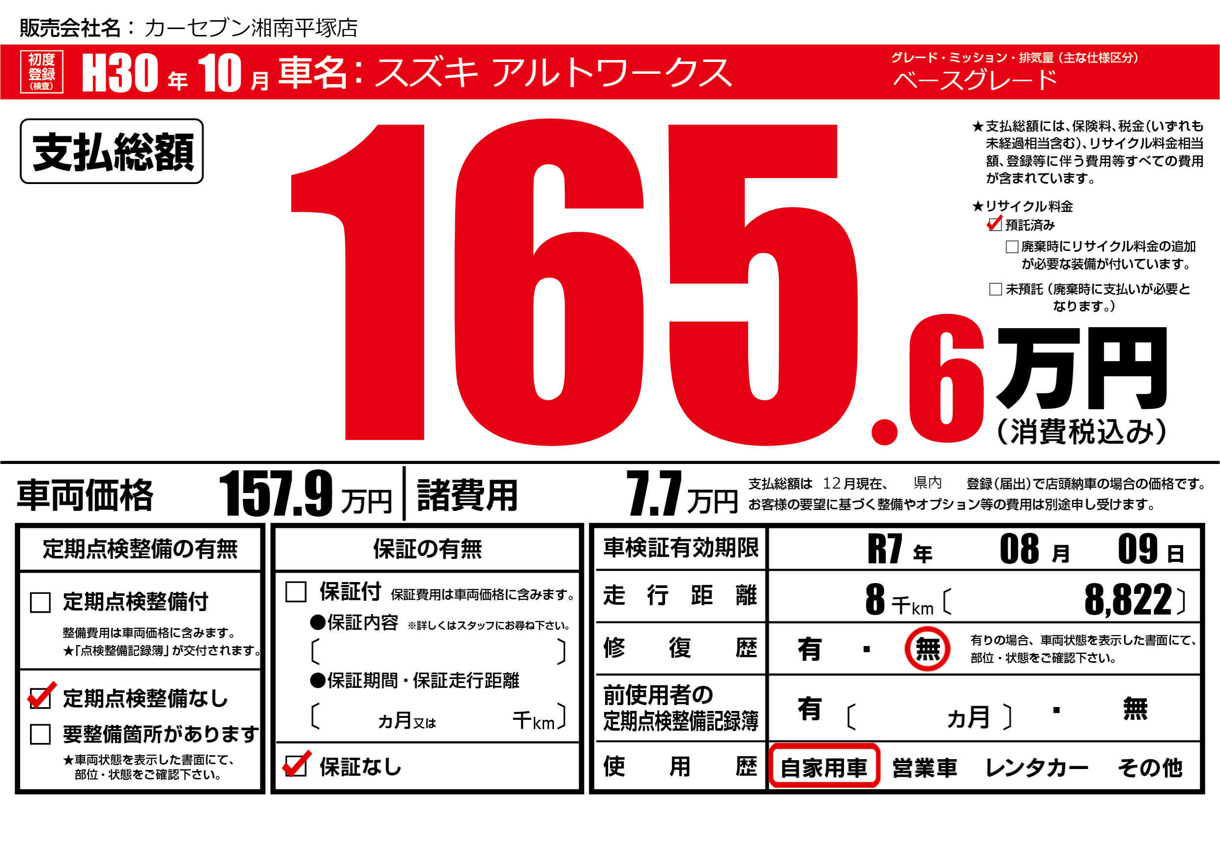 | 走行キロ | 0.8万km | 初年度登録 | H30年10月 |