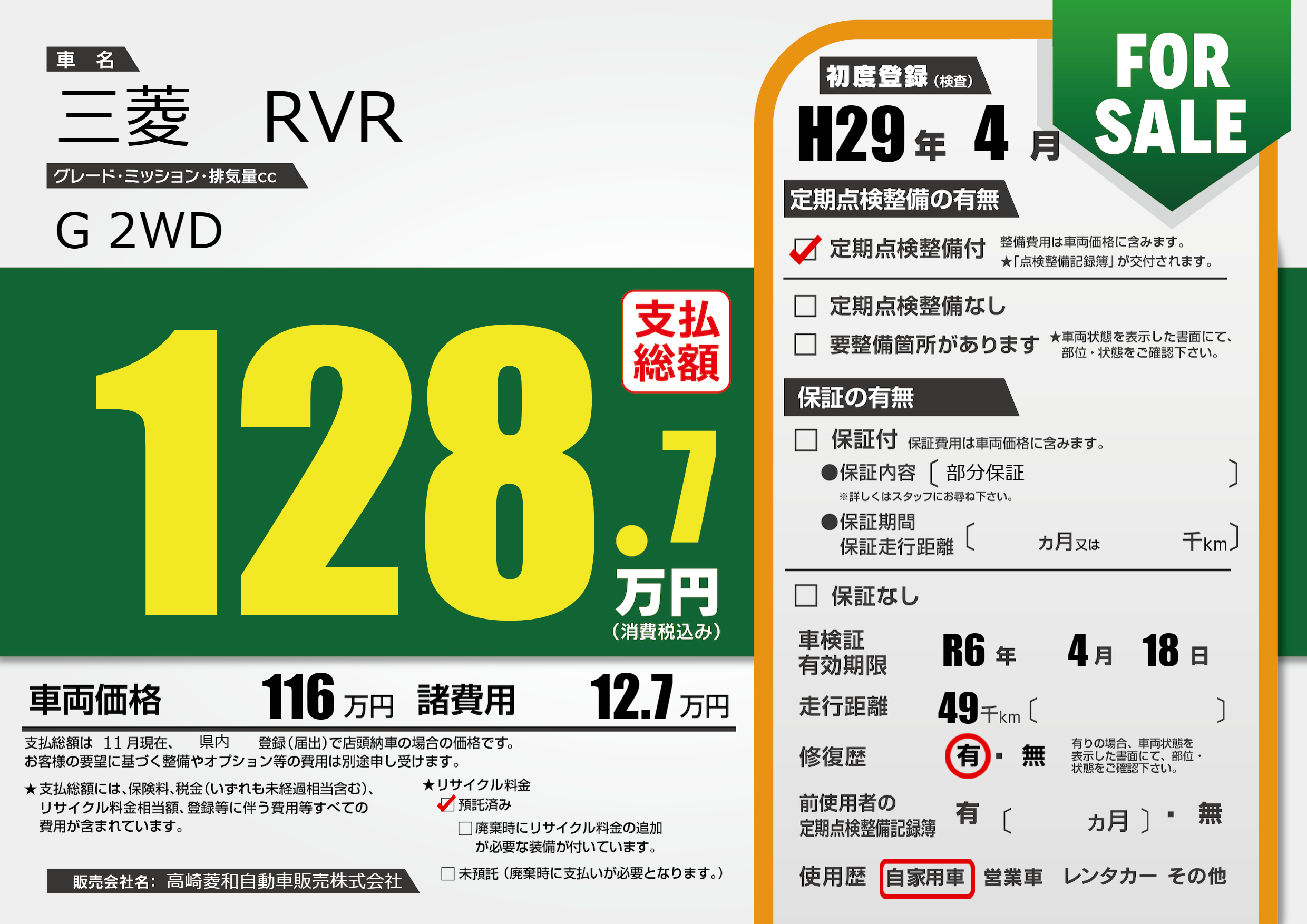 | 車名 | 三菱 RVR | グレード ミッション 排気量 |