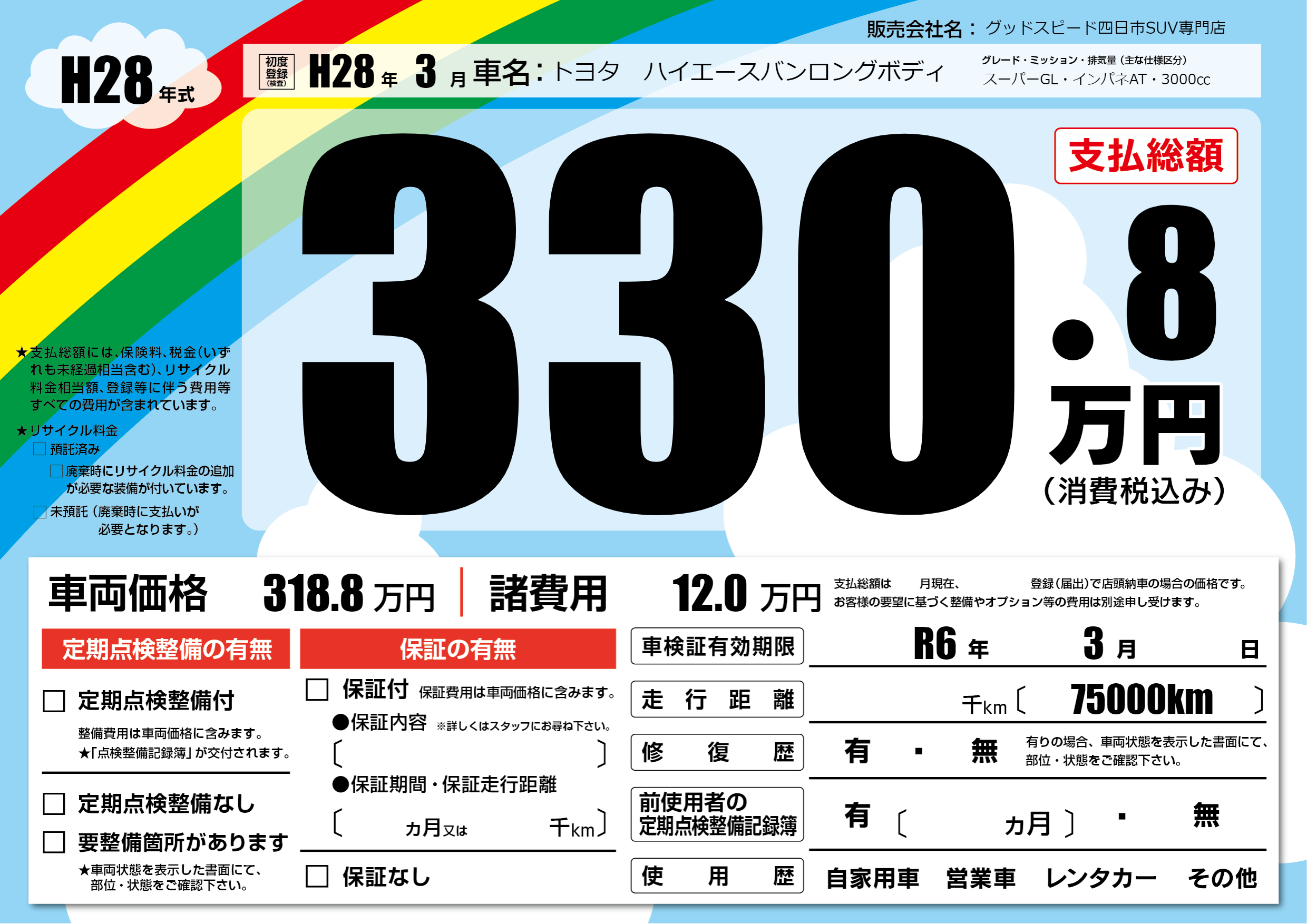 | 車名 | トヨタ ハイエースバンロングボディ | グレード ミッション 排気量 |