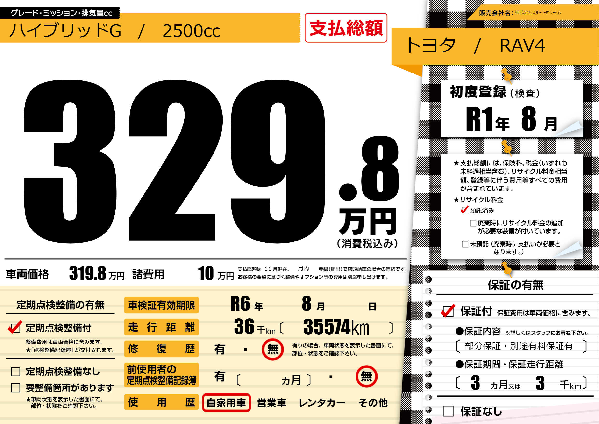 | 車名 | トヨタ / RAV4 | グレード ミッション 排気量 |