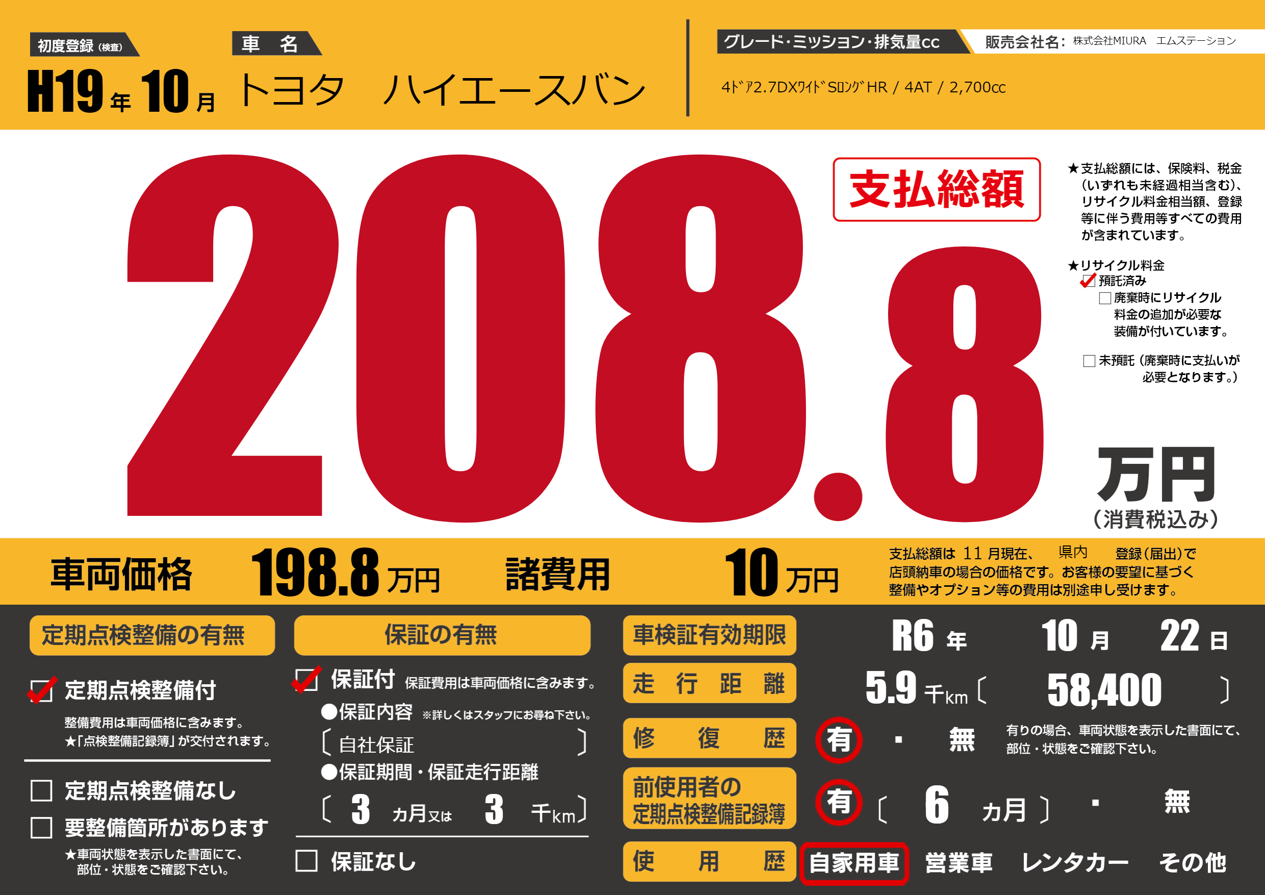 | 車名 | トヨタ ハイエースバン | グレード ミッション 排気量 |