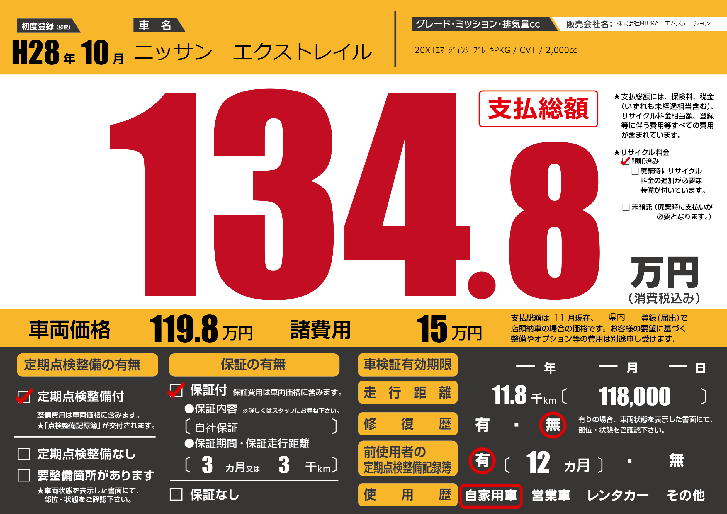 保証付き 保証内容(自社保証) 3ヶ月または3千km |